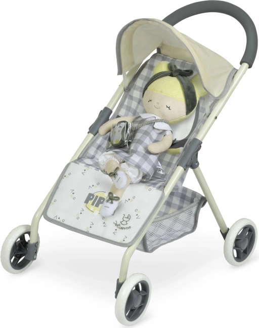 DeCuevas Αθλητικό καροτσάκι για κούκλες με την χαριτωμένη λούτρινη κούκλα PIPO είναι ιδανικό για μικρές δεσποινίδες. Αυτός ο κομψός σχεδιασμός με γκρι-λευκά καρό και απαλές κίτρινες πινελιές προσφέρει μια υπέροχη εμπειρία παιχνιδιού.