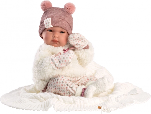 Η κούκλα είναι κομψά ντυμένη και περιλαμβάνει όλα τα απαραίτητα αξεσουάρ, όπως ζακέτες, σκούφο και διακοσμητική πιπίλα.