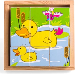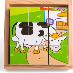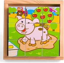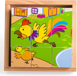 Εννέα ανθεκτικοί ξύλινοι κύβοι συνθέτουν συνολικά έξι χαριτωμένες εικόνες με ζωάκια. Τα παιδιά μπορούν να περιστρέφουν, να συνδυάζουν και να δημιουργούν, γεγονός που ενισχύει φυσικά τη λεπτή κινητικότητα, την δεξιοτεχνία και τη συγκέντρωση. Το σετ περιλαμβάνει ξύλινη βάση για εύκολη συναρμολόγηση και ασφαλή αποθήκευση – ιδανικό για το σπίτι και τα ταξίδια.