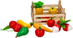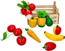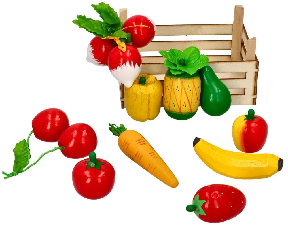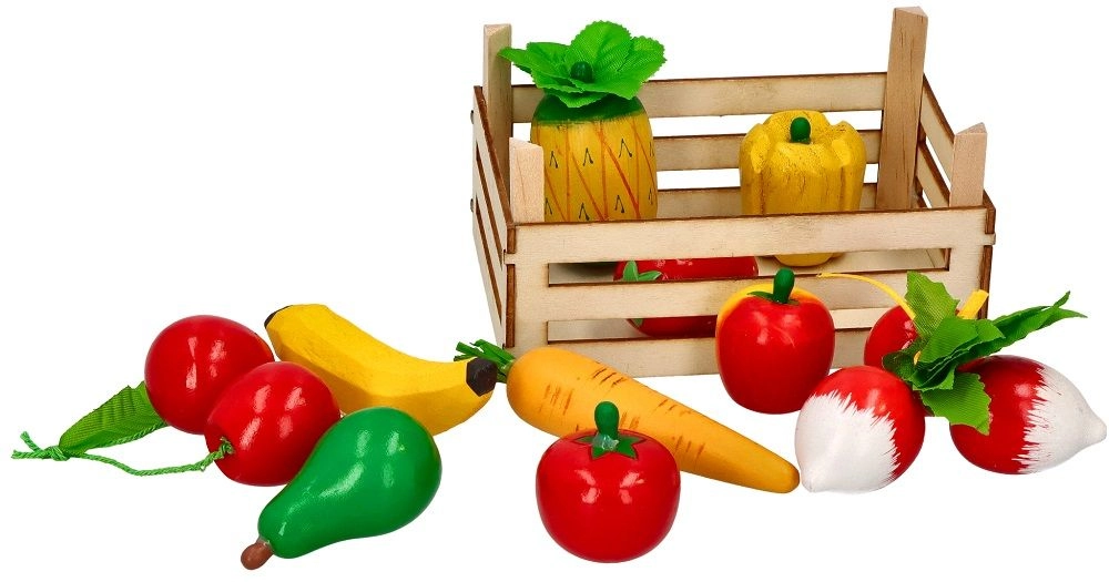 Ξύλινο καφάσι γεμάτο φρούτα και λαχανικά για μικρούς σεφ και πωλητές, ιδανικό βοήθημα για παιχνίδι στο μαγαζί ή την αγορά.