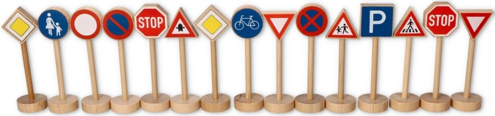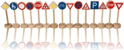 Περιλαμβάνει ποικιλία πινακίδων όπως Στοπ, Διάβαση πεζών και Στάθμευση. Το ύψος κάθε πινακίδας είναι 11 εκ. για εύκολο κράτημα.
