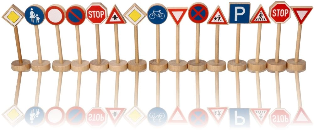 Το παιχνίδι με τις πινακίδες είναι εξαιρετική προετοιμασία για το πάρκο κυκλοφοριακής αγωγής και ιδανικό συμπλήρωμα για όλες τις ξύλινες και πλαστικές πίστες και δρόμους. Τα ασφαλή, έντονα χρώματα είναι μη τοξικά και κατάλληλα για παιδιά από 3 ετών.