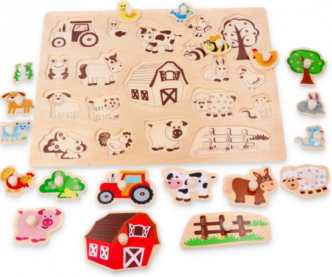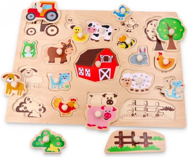 Αυτό το στιβαρό ξύλινο παζλ εισαγωγής φέρνει στα παιδιά την πρώτη γνωριμία με τον κόσμο της φάρμας. Τα χρωματιστά, βερνικωμένα κομμάτια με καθαρά περιγράμματα εφαρμόζουν εύκολα στη βάση από φυσικό ξύλο. Κάθε κομμάτι, χάρη στη λαβή του, κρατιέται καλά ακόμη και από μικρά χεράκια, γεγονός που υποστηρίζει την ανάπτυξη της λεπτής κινητικότητας και της υπομονής.