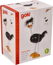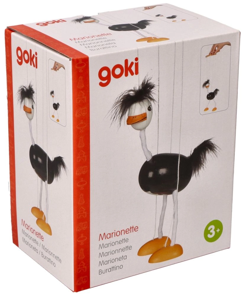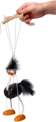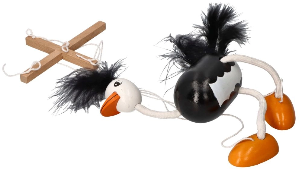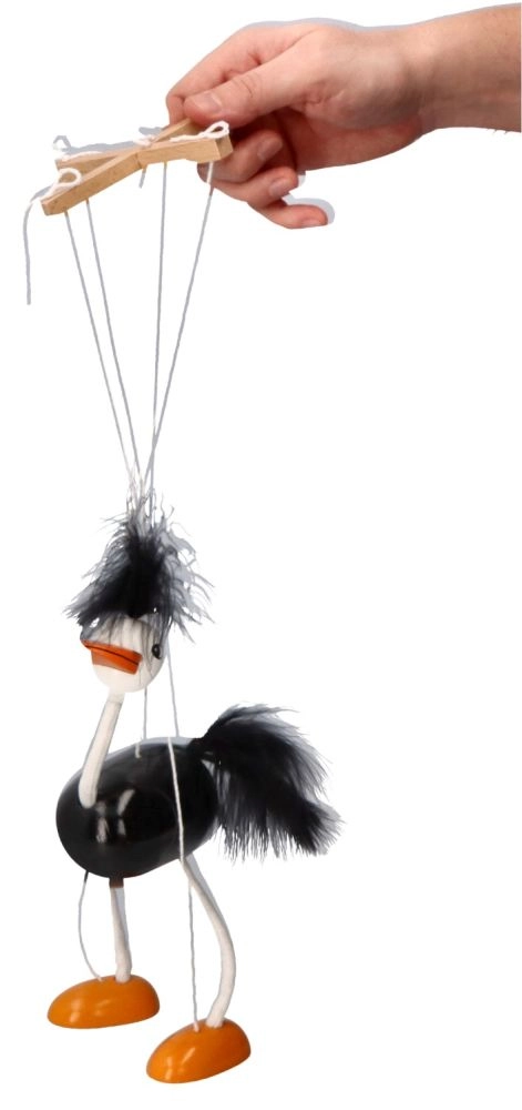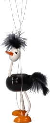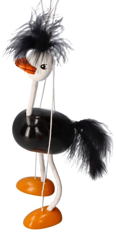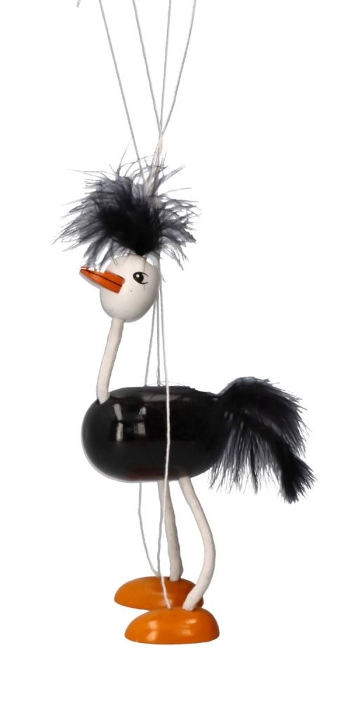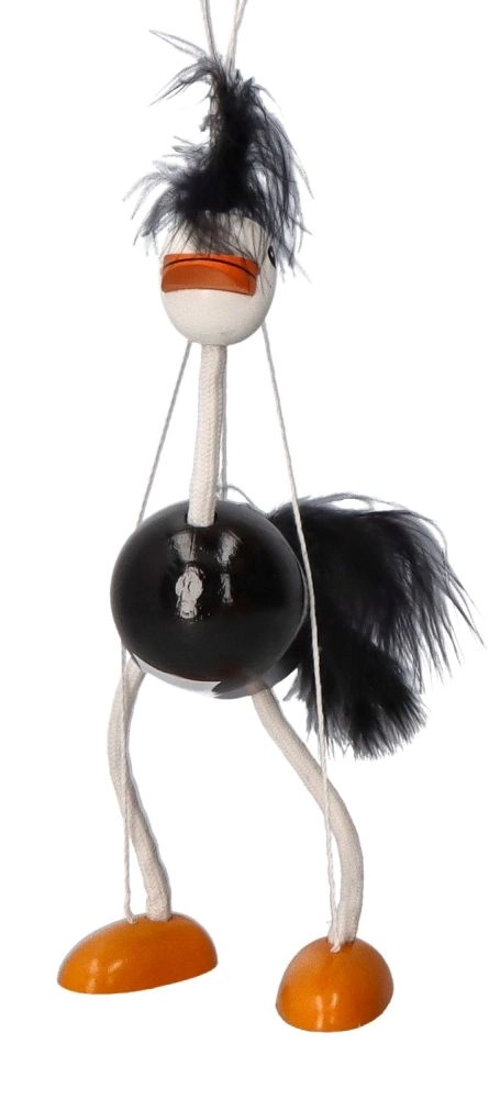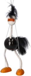 Η μαριονέτα έχει μαύρο σώμα, λευκά πόδια και κεφάλι, με έντονα πορτοκαλί πέλματα. Ζεστές και απαλές λεπτομέρειες στο κεφάλι και την ουρά συμβάλλουν στη παιχνιδιάρικη εμφάνισή της. Τα παιδιά θα αγαπήσουν τον τρόπο που κινείται αυτή η στρουθοκάμηλος και το πόσο εύκολα χειρίζεται.
