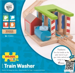 Το προϊόν είναι κατασκευασμένο από ποιοτικά και υπεύθυνα προερχόμενα φυσικά υλικά και πληροί τα σύγχρονα ευρωπαϊκά πρότυπα ασφαλείας. Χάρη στις καθολικές διαστάσεις του, το πλυντήριο είναι συμβατό με τις περισσότερες ξύλινες ράγες και τρενάκια της αγοράς. Το τρένο δεν περιλαμβάνεται στη συσκευασία, κάτι που επιτρέπει εύκολη σύνδεση με υπάρχοντα σετ.