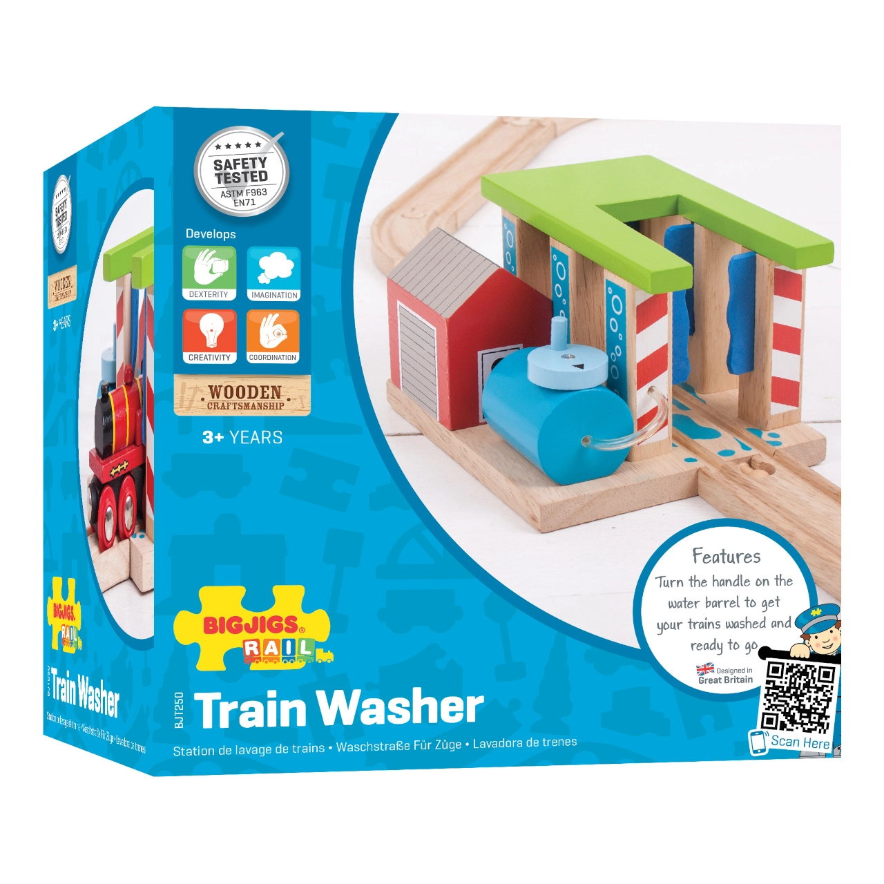Το πλυντήριο συνδέεται ομαλά με τις ράγες και τα τρενάκια BIGJIGS RAIL και άλλων γνωστών brands, ώστε να επεκτείνετε εύκολα το υπάρχον σετ σας.