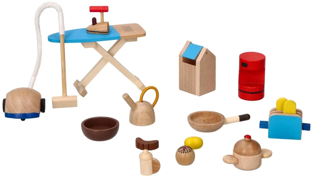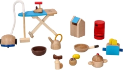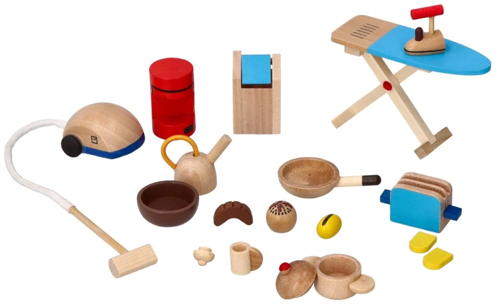 Με αυτό το υπέροχο σετ 19 ξύλινων παιχνιδιών τα παιδιά θα απολαύσουν ώρες διασκέδασης στο οικιακό περιβάλλον. Το σετ περιλαμβάνει διάφορες οικιακές συσκευές που συμβάλλουν στην παιδική ανάπτυξη και στη γνωριμία με τον κόσμο γύρω μας. Στη συσκευασία θα βρείτε παιχνίδια όπως καφετιέρα, τσαγιέρα, ηλεκτρική σκούπα, σιδερώστρα και πολλά άλλα. Κάθε κομμάτι είναι προσεκτικά κατασκευασμένο με έμφαση στην ασφάλεια και την αισθητική.