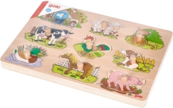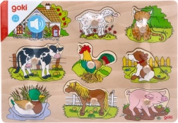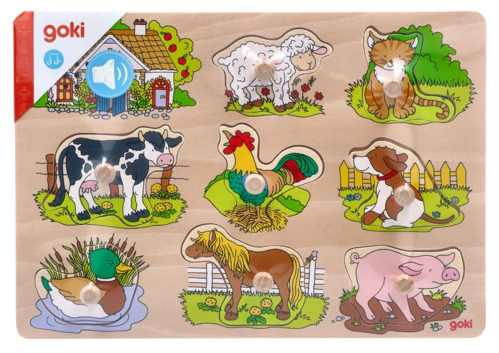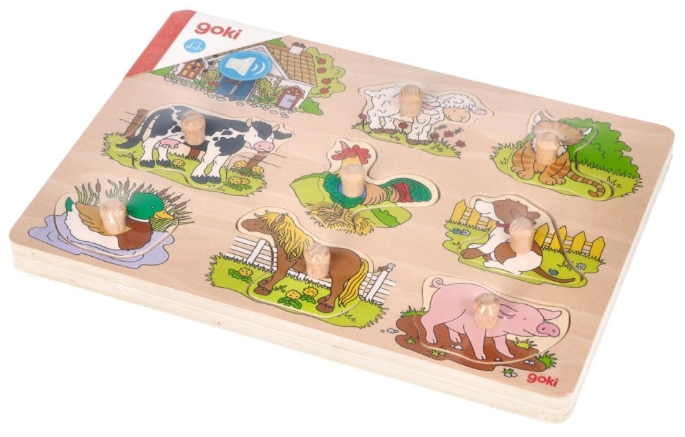 Αυτό το ξύλινο παζλ-συναρμολόγηση περιλαμβάνει οκτώ κομμάτια με εικόνες οικόσιτων ζώων, τα οποία όταν τοποθετηθούν στη σωστή θέση παράγουν τον χαρακτηριστικό τους ήχο. Κάθε κομμάτι διαθέτει ξύλινη λαβή, που εξασφαλίζει ευκολότερο χειρισμό και ασφαλή τοποθέτηση στη βάση. Η ξύλινη βάση με ακριβείς εγκοπές βοηθά τα παιδιά να τοποθετούν τα κομμάτια στις σωστές θέσεις.