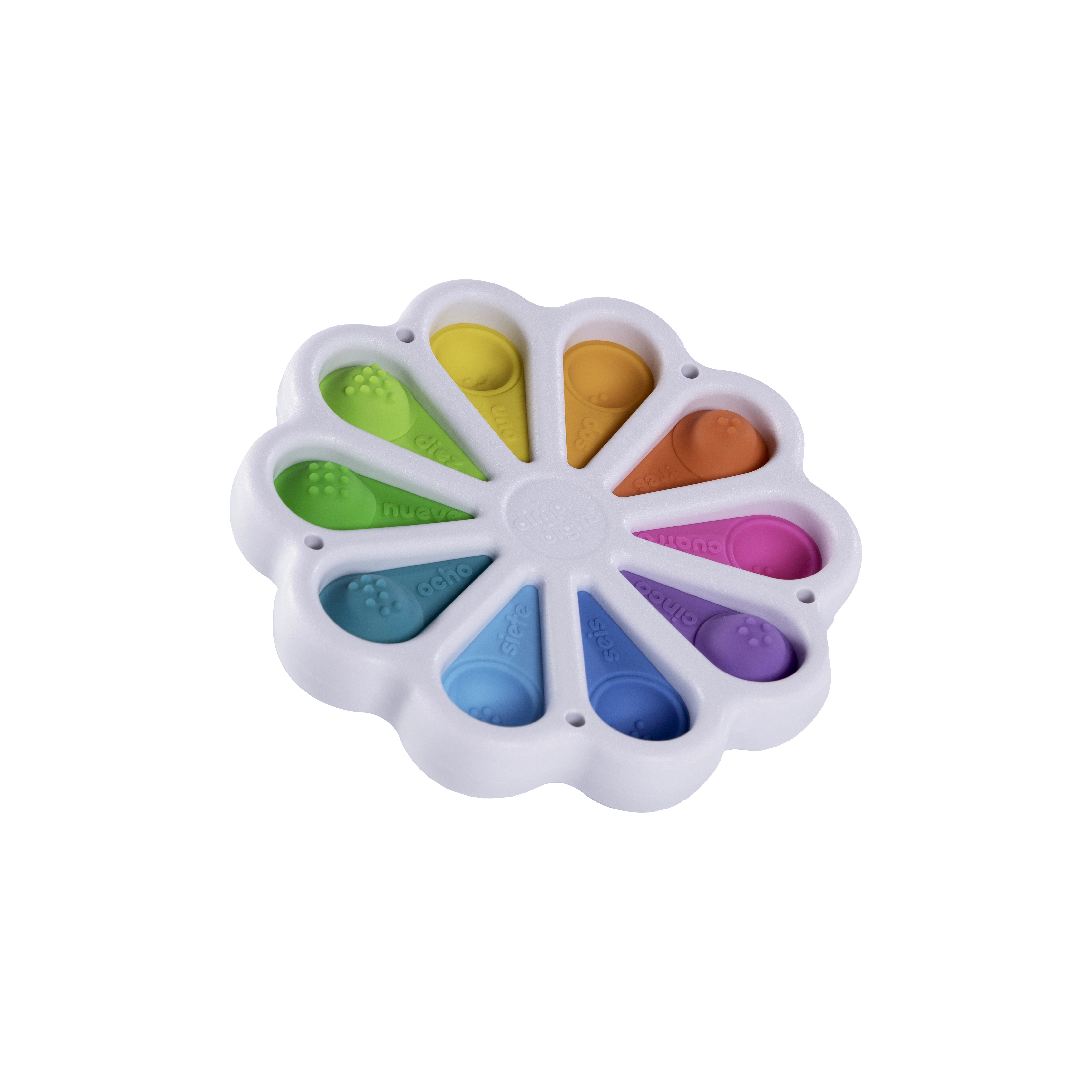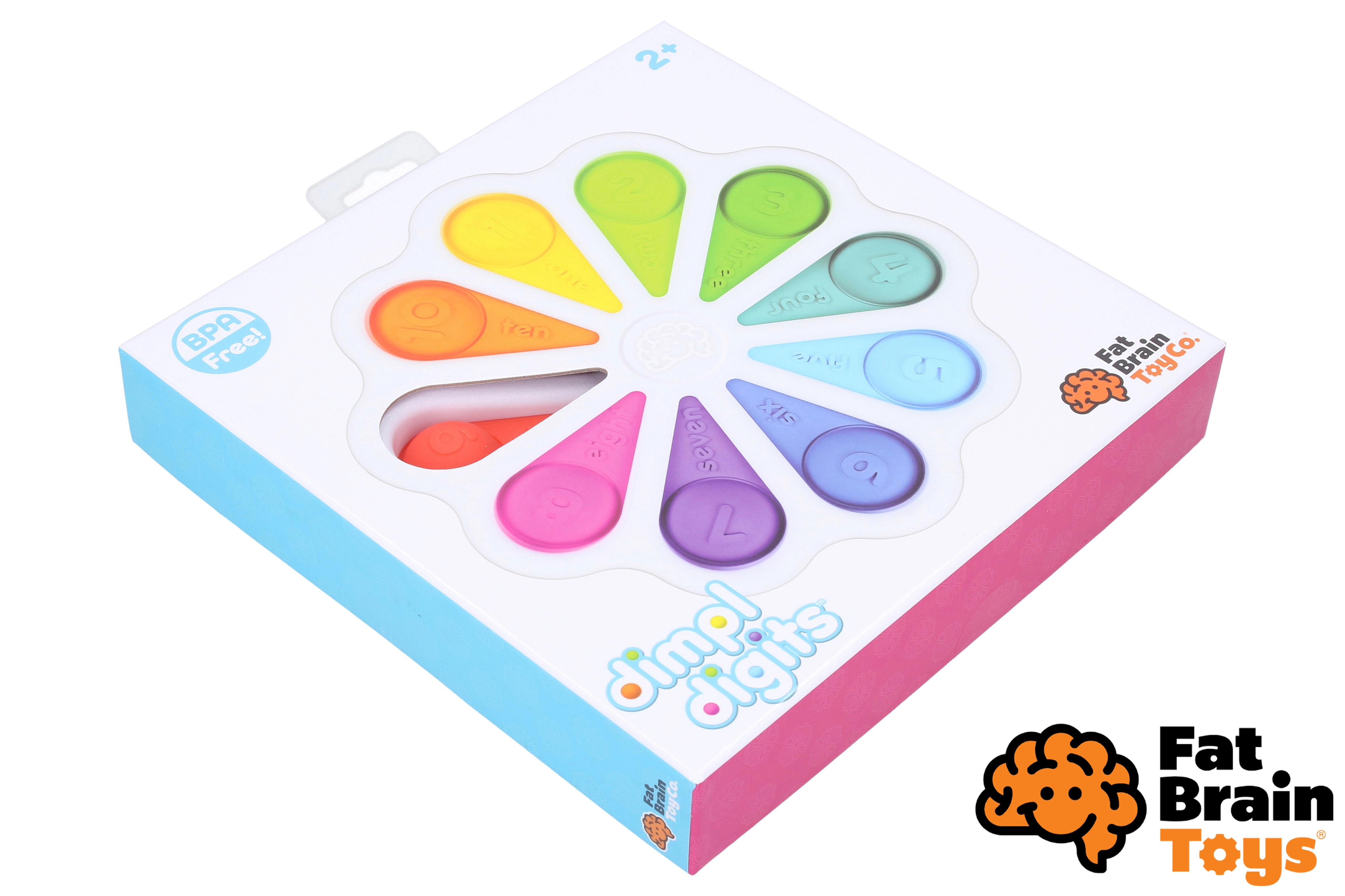 Το αισθητηριακό παιχνίδι Dimpl Digits προσφέρει στα παιδιά μια χαλαρωτική pop αίσθηση και ταυτόχρονα τα πρώτα βήματα στην κατανόηση των αριθμών. Στην επάνω πλευρά κάθε φούσκας υπάρχει το ψηφίο με την αγγλική λέξη, ενώ στην κάτω πλευρά ο αντίστοιχος αριθμός τελειών – έτσι τα παιδιά συνδέουν φυσικά την όραση, την αφή και τις βασικές μαθηματικές δεξιότητες.