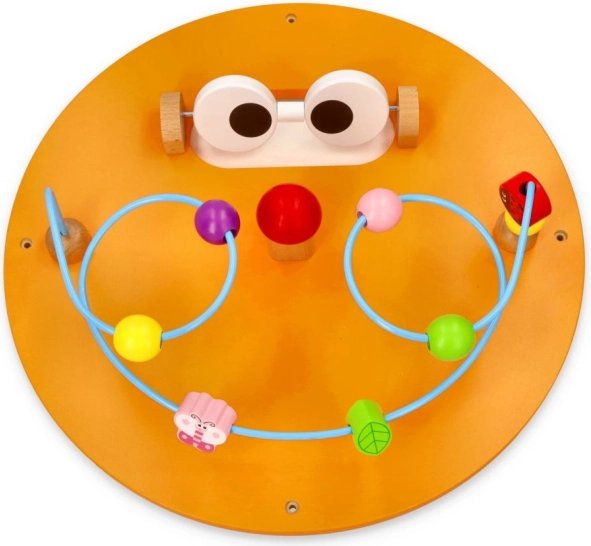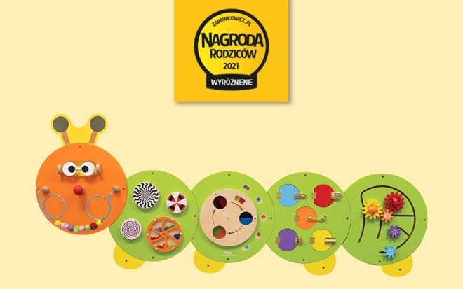 Το κεφάλι της κάμπιας διαθέτει μεταλλικό βρόχο με ξύλινες χάντρες που τα παιδιά μπορούν να μετακινούν κατά μήκος του λαβυρίνθου.