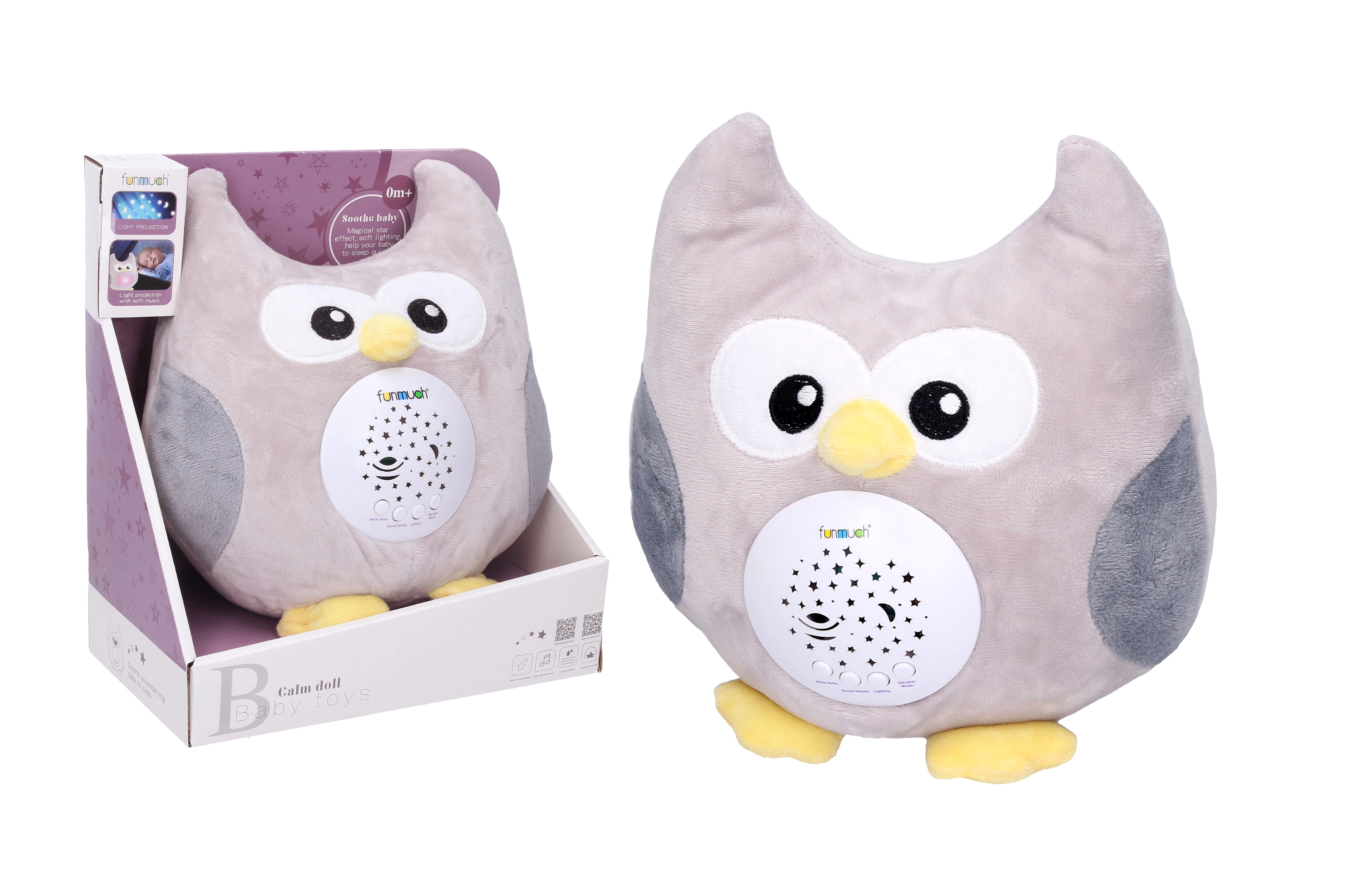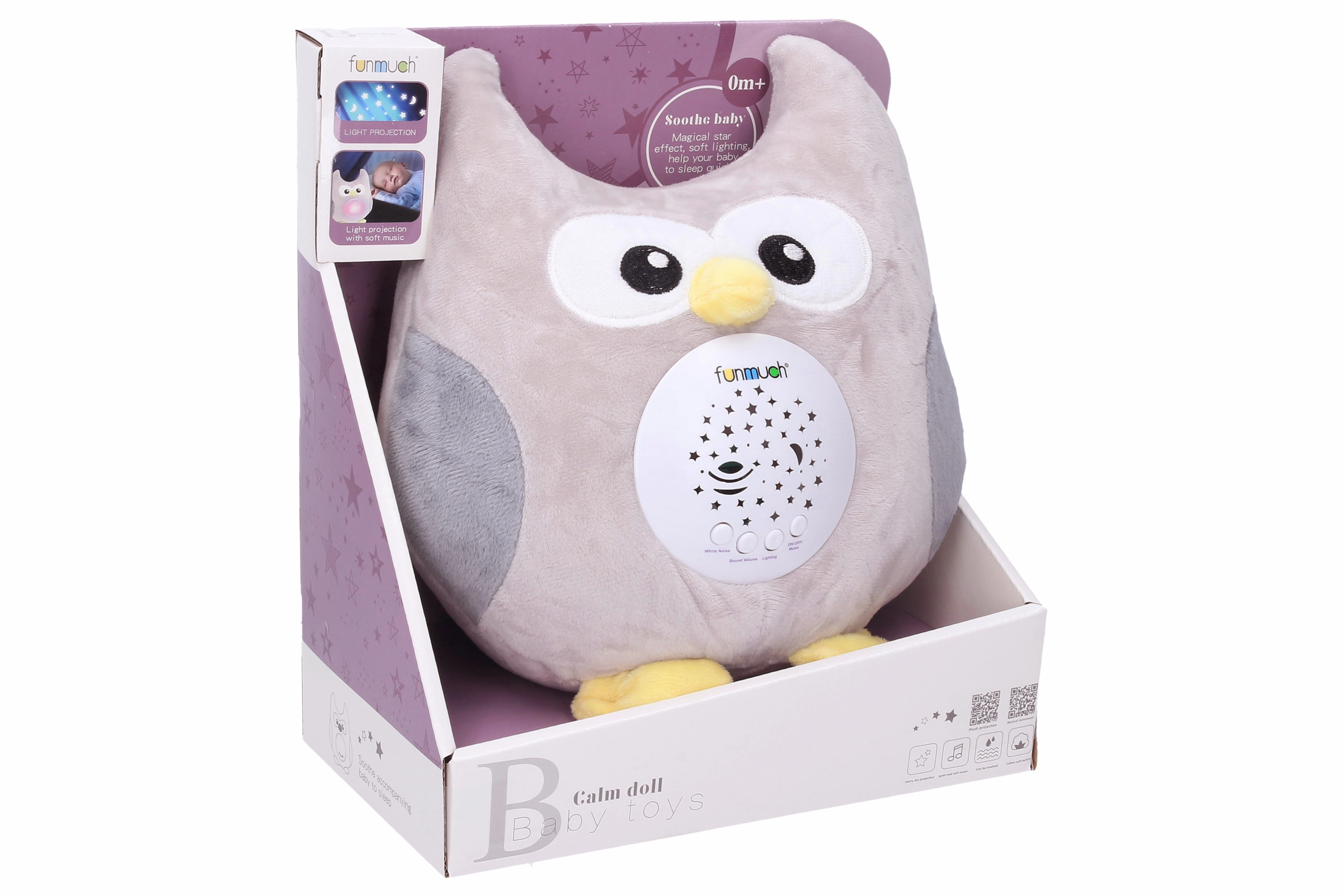 Ένα χαριτωμένο κουκλάκι ύπνου σε σχήμα κουκουβάγιας που βοηθά το μωρό σας να αποκοιμηθεί ήρεμα χάρη στις ευχάριστες μελωδίες, τον καταπραϋντικό θόρυβο και την προβολή ενός έναστρου ουρανού στο ταβάνι ή στους τοίχους. Ιδανικό από τη γέννηση για να δημιουργεί μια γαλήνια ατμόσφαιρα πριν τον ύπνο.