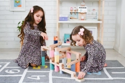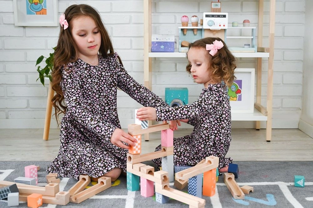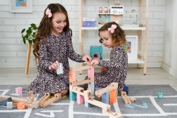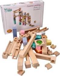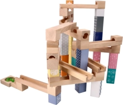 Τα 53 προσεγμένα ξύλινα κομμάτια επιτρέπουν τη δημιουργία απλών και σύνθετων διαδρομών. Τα παιδιά πειραματίζονται, βελτιώνουν τα σχέδιά τους και μαθαίνουν τις αρχές της βαρύτητας και της ταχύτητας.