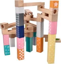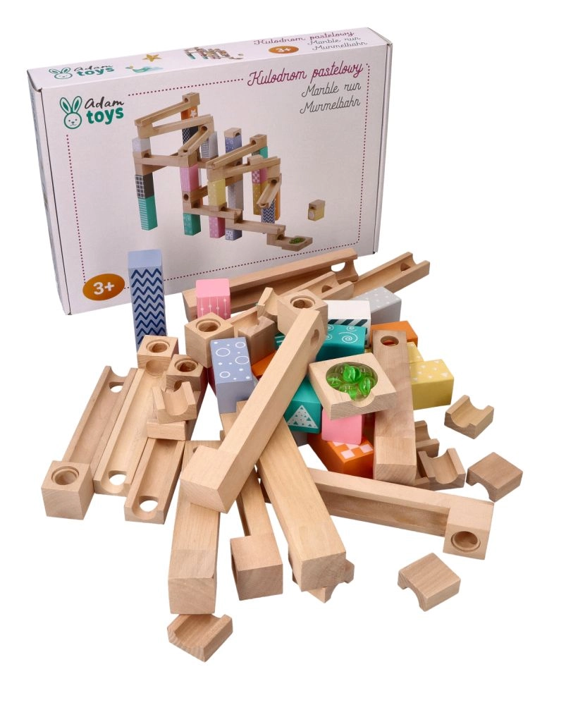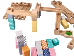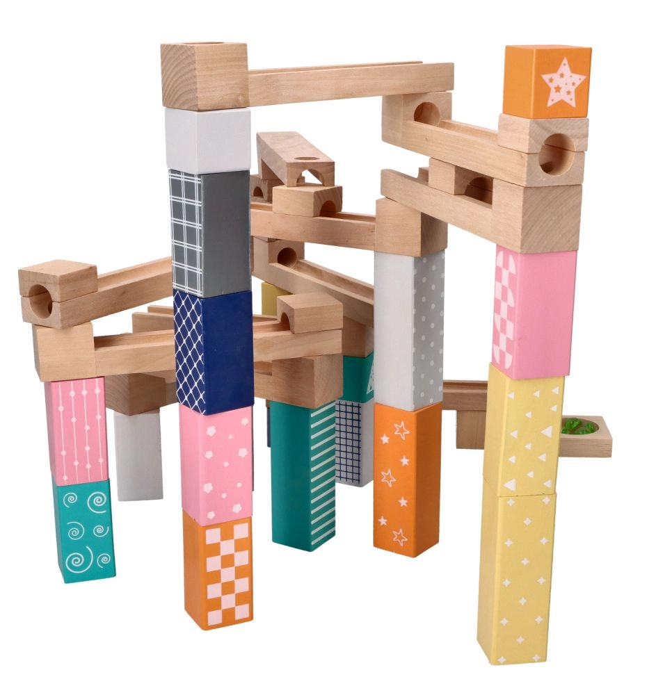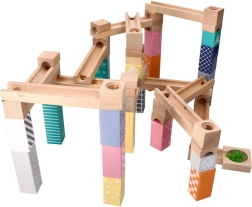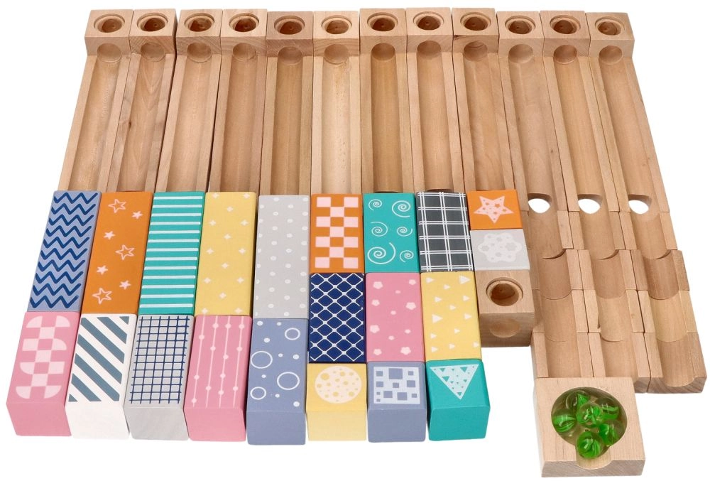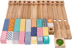 Αυτή η ποιοτική ξύλινη μαρμπλοράμπα σε απαλές παστέλ αποχρώσεις επιτρέπει στα παιδιά να χτίζουν πρωτότυπες διαδρομές και να παρακολουθούν τις μπίλιες να γλιστρούν σε αυλάκια, γέφυρες και ανοίγματα. Τα ανθεκτικά ξύλινα τουβλάκια με τυπωμένα μοτίβα προσφέρουν σταθερότητα και οπτική ελκυστικότητα και αναπτύσσουν τη χωρική φαντασία.