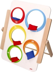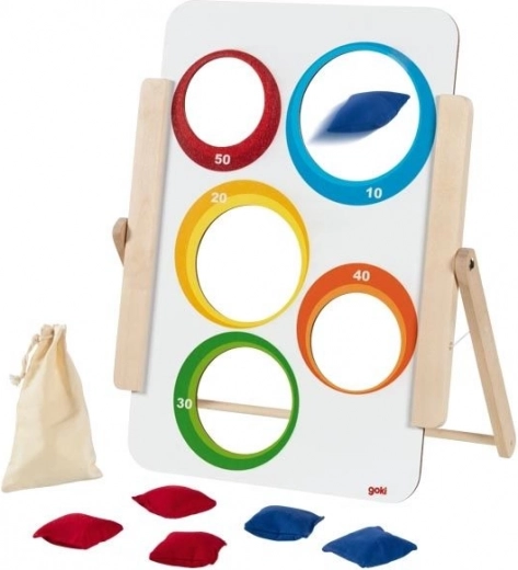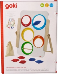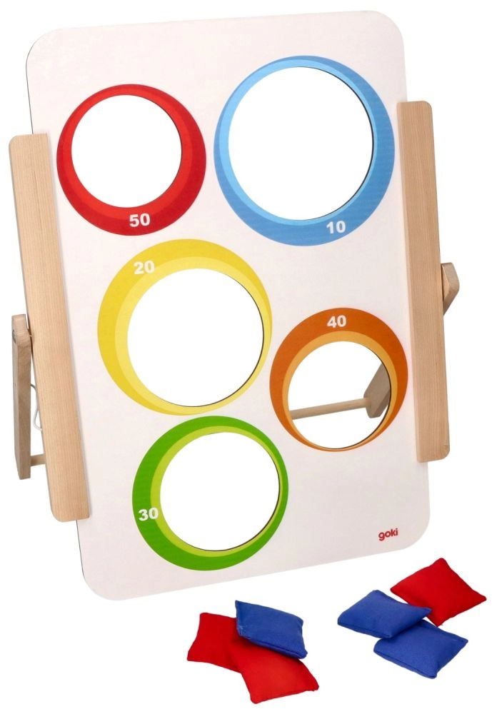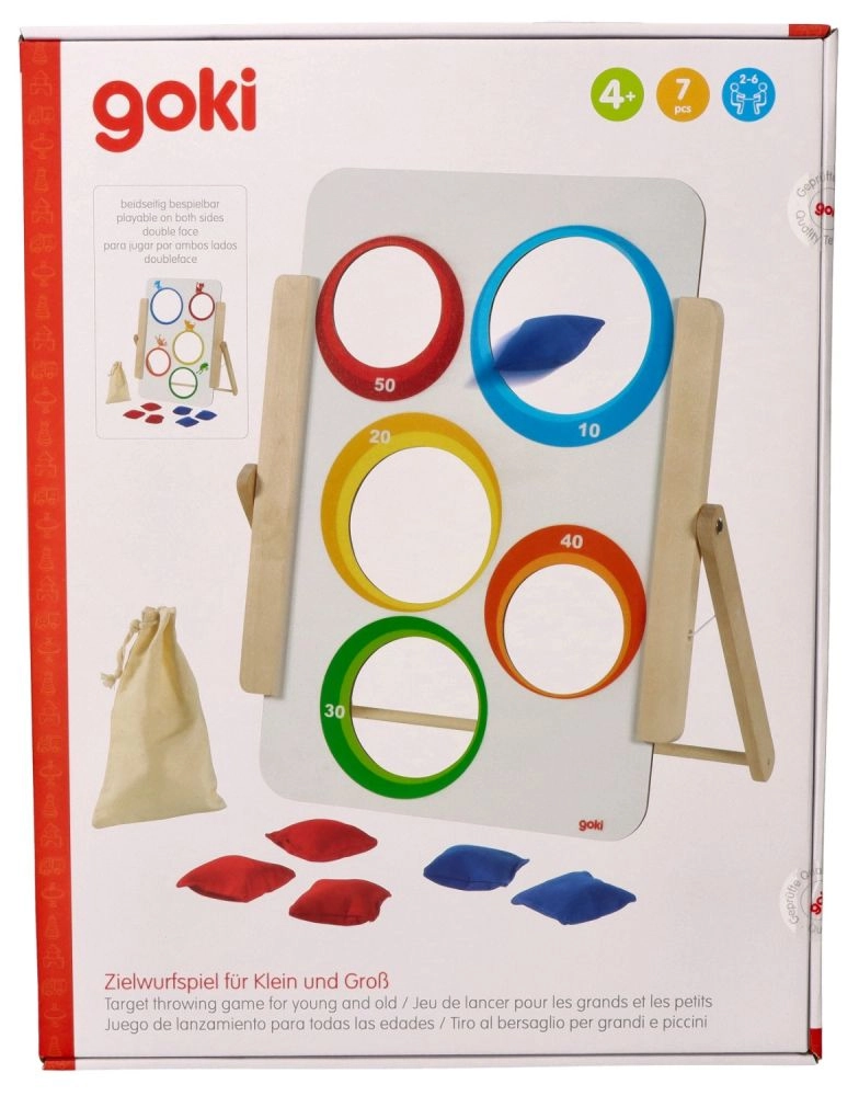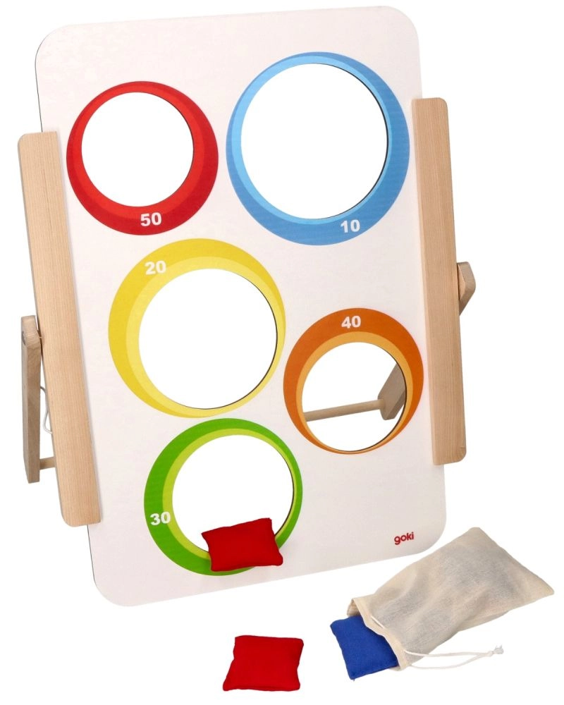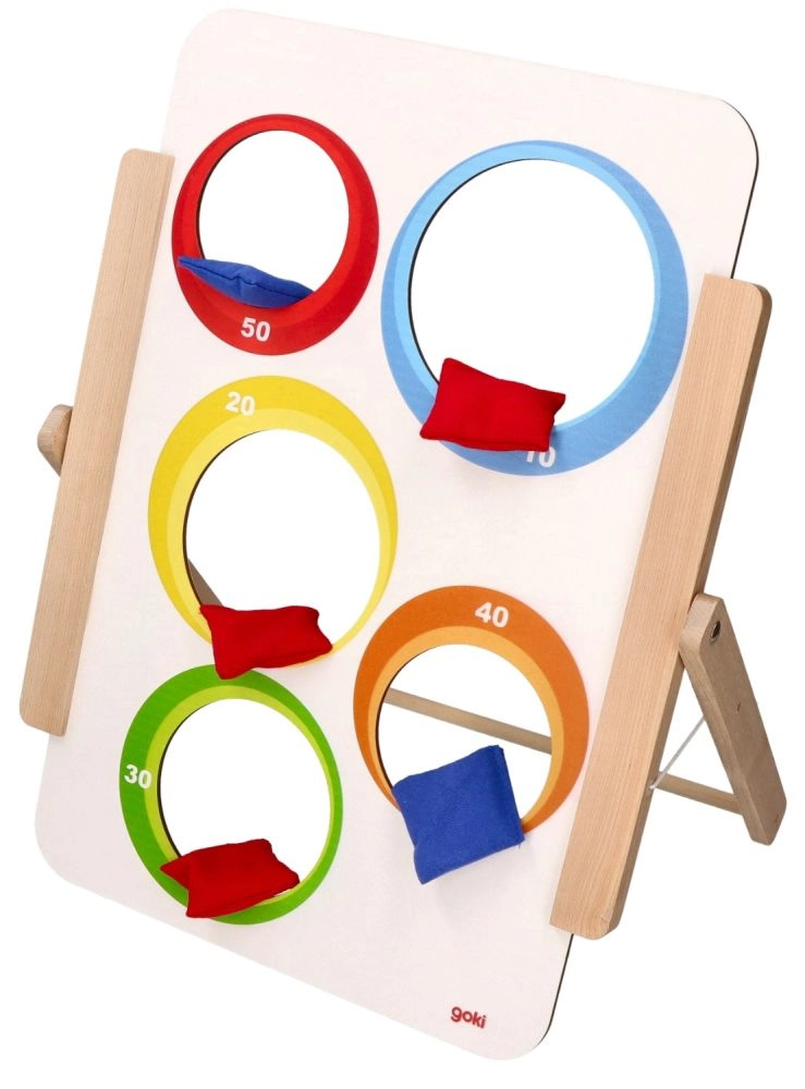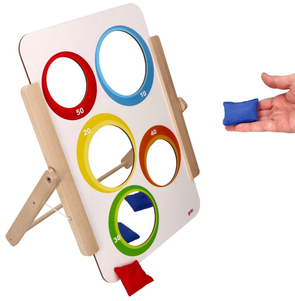 Το παιχνίδι ρίψης σε στόχο της Goki προσφέρει απλή αλλά εθιστική διασκέδαση για μικρούς και μεγάλους. Η ξύλινη σανίδα με πέντε οπές είναι εικονογραφημένη με ζωάκια από τη μία πλευρά και έχει αριθμημένες τιμές βαθμών (10–50) από την άλλη. Τα παιδιά εξασκούν την ακρίβεια, τη συγκέντρωση και τη λεπτή κινητικότητα, ενώ ανταγωνίζονται για το υψηλότερο σκορ.