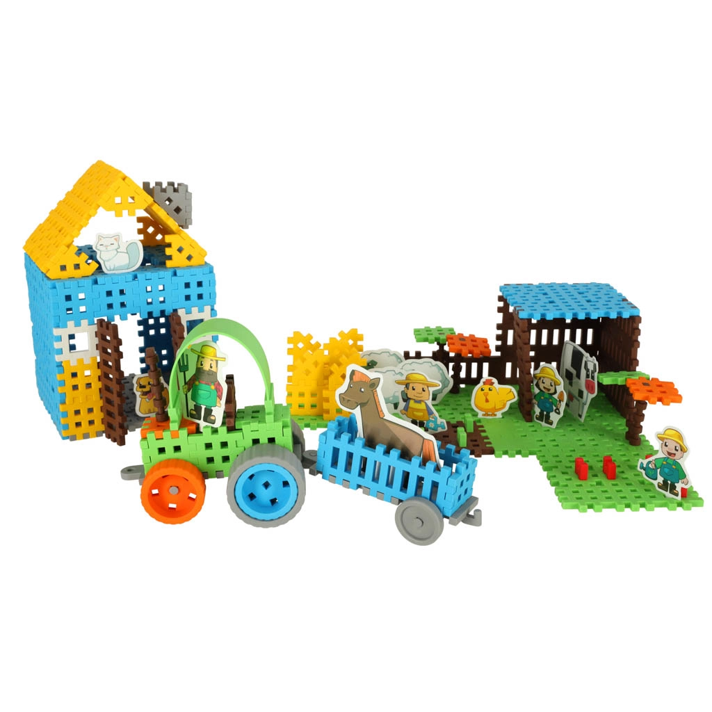 Η δημιουργία και η κατασκευή διαφορετικών δομών αναπτύσσουν τη λογική σκέψη και προσφέρουν διασκέδαση. Το σετ περιλαμβάνει αγροτικό τρακτέρ και διάφορα αξεσουάρ, που κρατούν τα παιδιά απασχολημένα για πολλή ώρα.