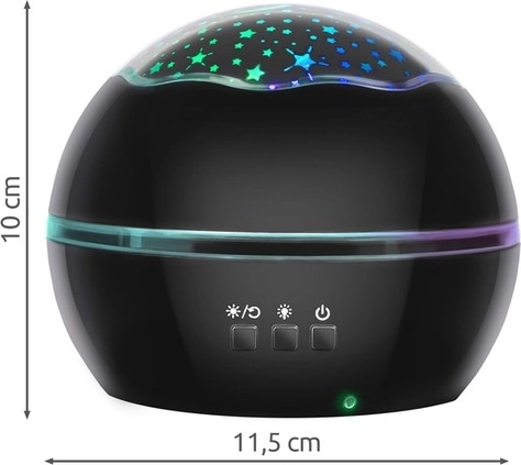 Η συσκευή προσφέρει περιστρεφόμενο θόλο, 4 χρώματα φωτισμού (πράσινο, μπλε, λευκό, κόκκινο) και 3 λειτουργικά κουμπιά για απλό χειρισμό. Η τροφοδοσία είναι δυνατή μέσω USB ή 4× AAA μπαταριών (δεν περιλαμβάνονται), ώστε να χρησιμοποιείτε το φωτάκι εύκολα στο σπίτι ή στα ταξίδια.