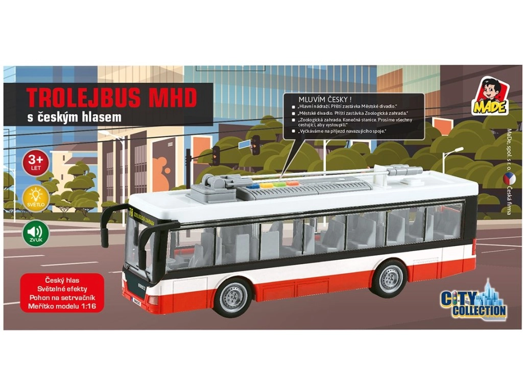 Ρεαλιστικό τρόλεϊ αστικών συγκοινωνιών με κίνηση αδράνειας, με τσεχική φωνή και φωτεινά εφέ, που θα ενθουσιάσει μικρούς οδηγούς και φίλους των ΜΜΜ. Αναπαράγει ανακοινώσεις στάσεων στα τσεχικά, έχει τσεχικό σχεδιασμό γνωστό από τις πόλεις μας και χάρη στην κίνηση αδράνειας κινείται εύκολα χωρίς ανάγκη τηλεχειρισμού. Οι μπαταρίες περιλαμβάνονται.