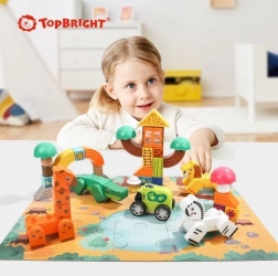 Πολύχρωμα ξύλινα τουβλάκια επιτρέπουν τη συναρμολόγηση οχήματος εκτός δρόμου, κτιρίων και χαριτωμένων ζώων. Λεπτομέρειες όπως λουλούδια και καμάρα προσθέτουν μοναδική γοητεία στο παιχνίδι.