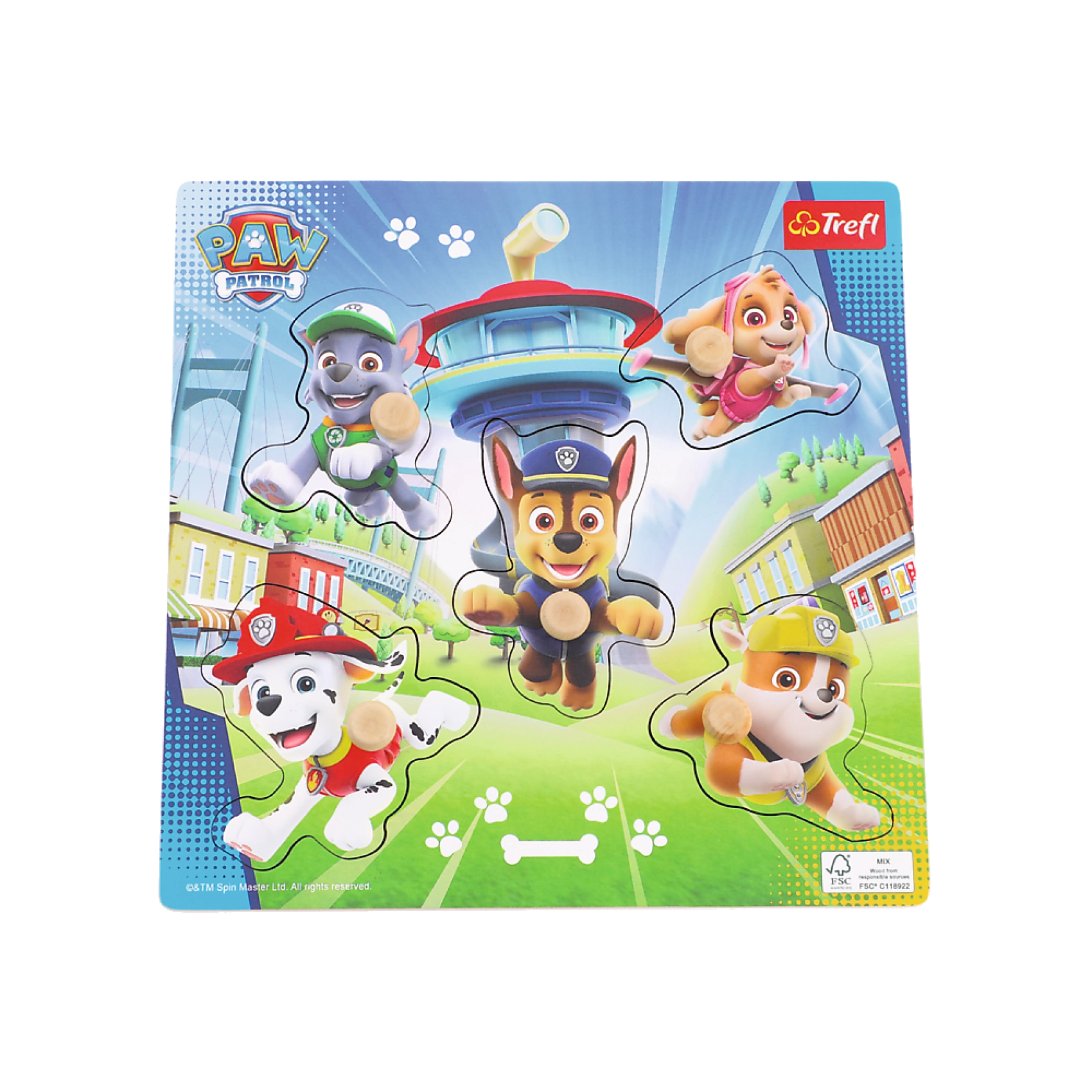 Το ξύλινο παζλ με άδεια PAW Patrol προσφέρει έναν ασφαλή και διασκεδαστικό τρόπο μάθησης. Χάρη στα πέντε αποσπώμενα κομμάτια με ξύλινη λαβή, τα παιδιά κρατούν το παζλ με άνεση και τα επανατοποθετούν εύκολα στη βάση. Η ασπρόμαυρη απεικόνιση στις εσοχές αντιστοιχεί στα σχέδια των κομματιών, βοηθώντας τα παιδιά να βρουν το σωστό σημείο.