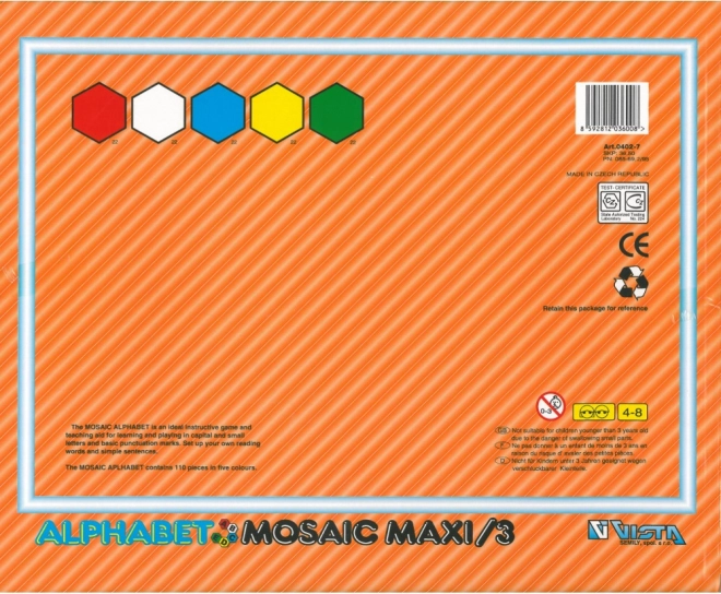 Ανακαλύψτε τον κόσμο των γραμμάτων με το πολύχρωμο σετ Alphabet Mosaic Maxi. Χάρη στα μεγάλα κομμάτια σε κίτρινο, κόκκινο, πράσινο, μπλε και λευκό χρώμα, τα παιδιά εξοικειώνονται με την αγγλική αλφαβήτα, μαθαίνουν να συνθέτουν απλές λέξεις και καλλιεργούν τη φαντασία και την υπομονή τους.