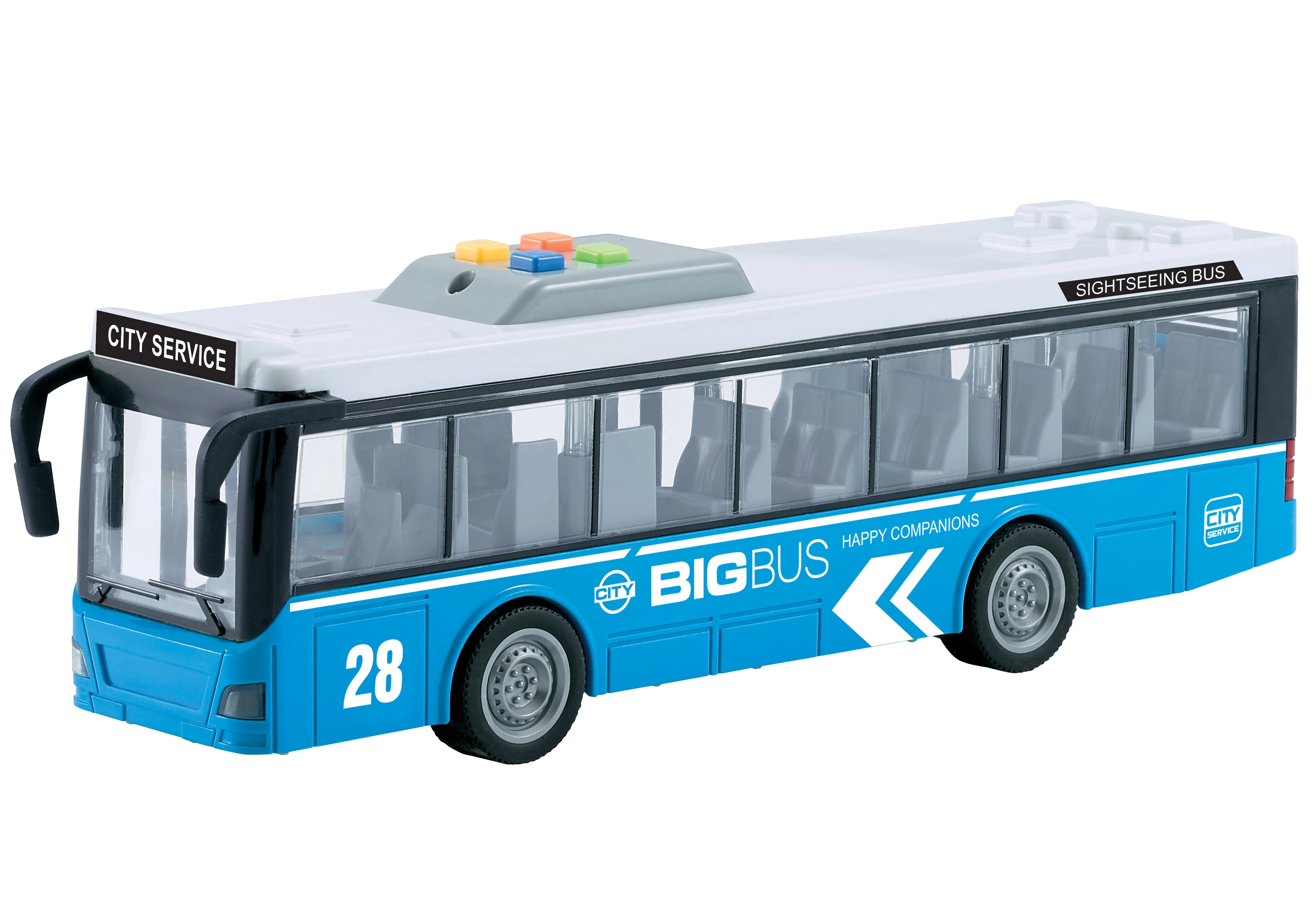 Αυτό το παιχνιδιάρικο λεωφορείο με μηχανισμό αδράνειας είναι η ιδανική επιλογή για κάθε παιδί. Έχει μήκος 29 cm και είναι εξοπλισμένο με μια σειρά από εξαιρετικά εφέ: