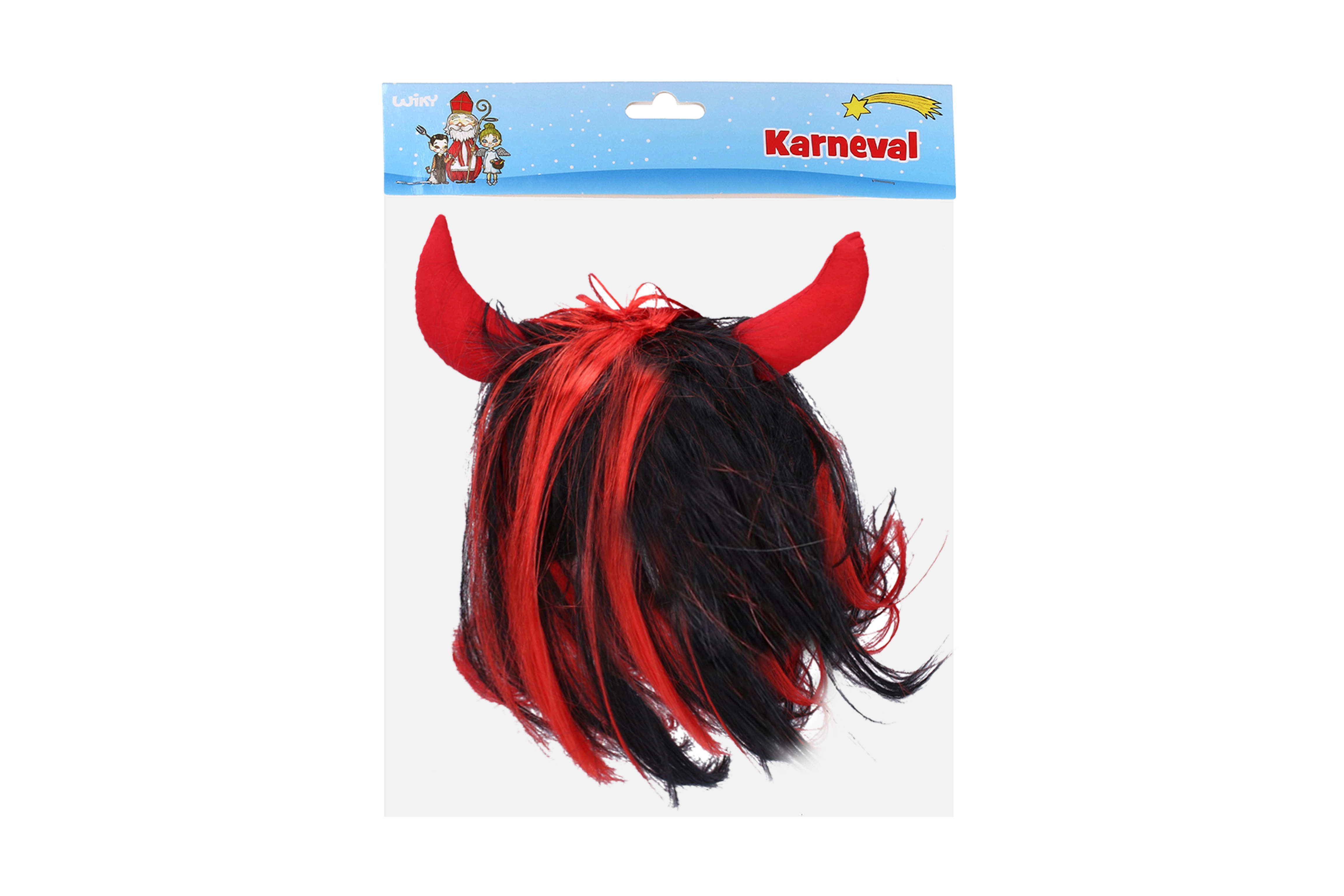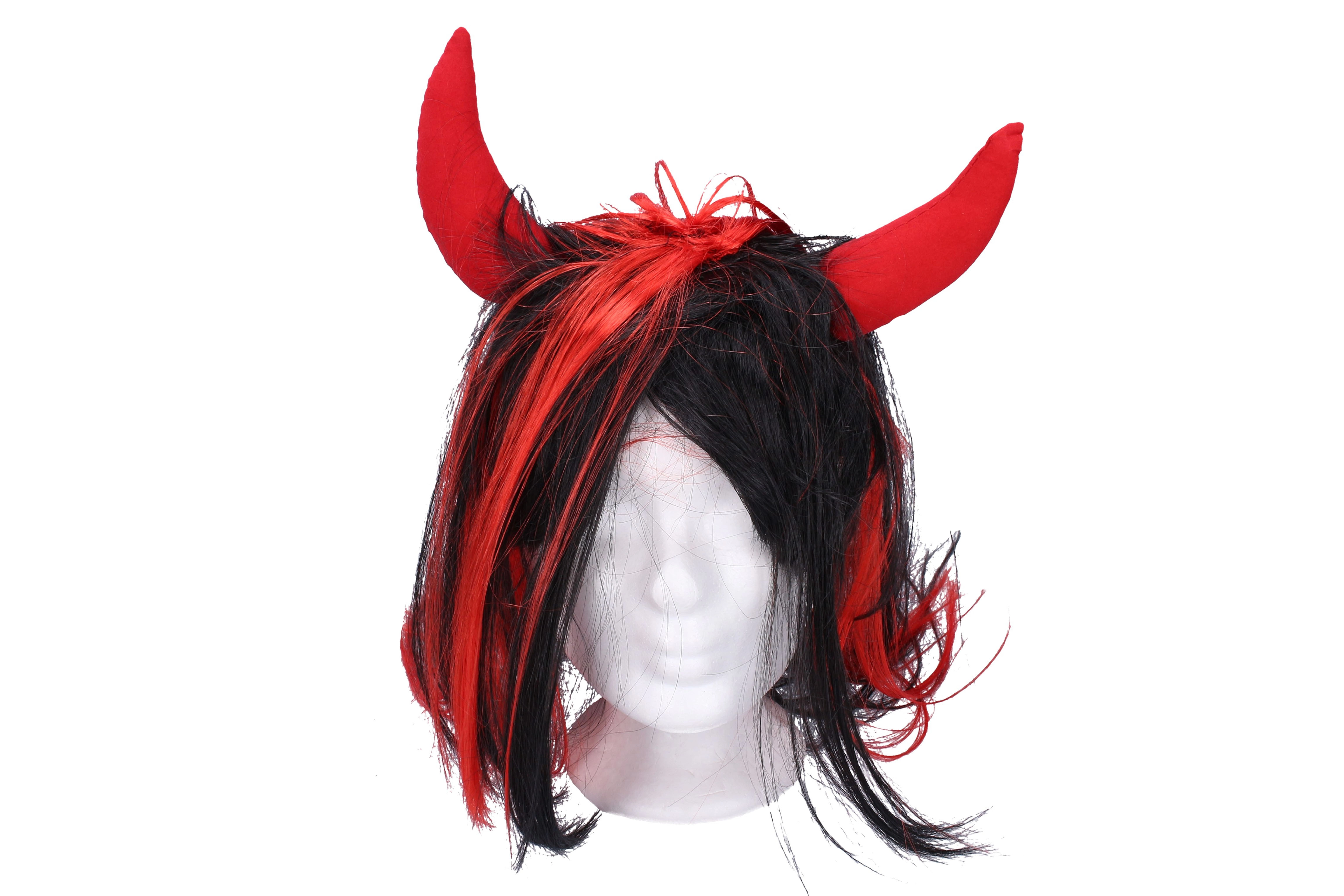 Στιλάτη διαβολική περούκα με μαύρα μαλλιά και κόκκινες τούφες, συμπληρωμένη με υφασμάτινα κόκκινα κέρατα. Ιδανική για τον Άγιο Νικόλαο, αποκριάτικους χορούς και θεματικά πάρτι. Εύκολη εφαρμογή και άμεσο «κολασμένο» εφέ.