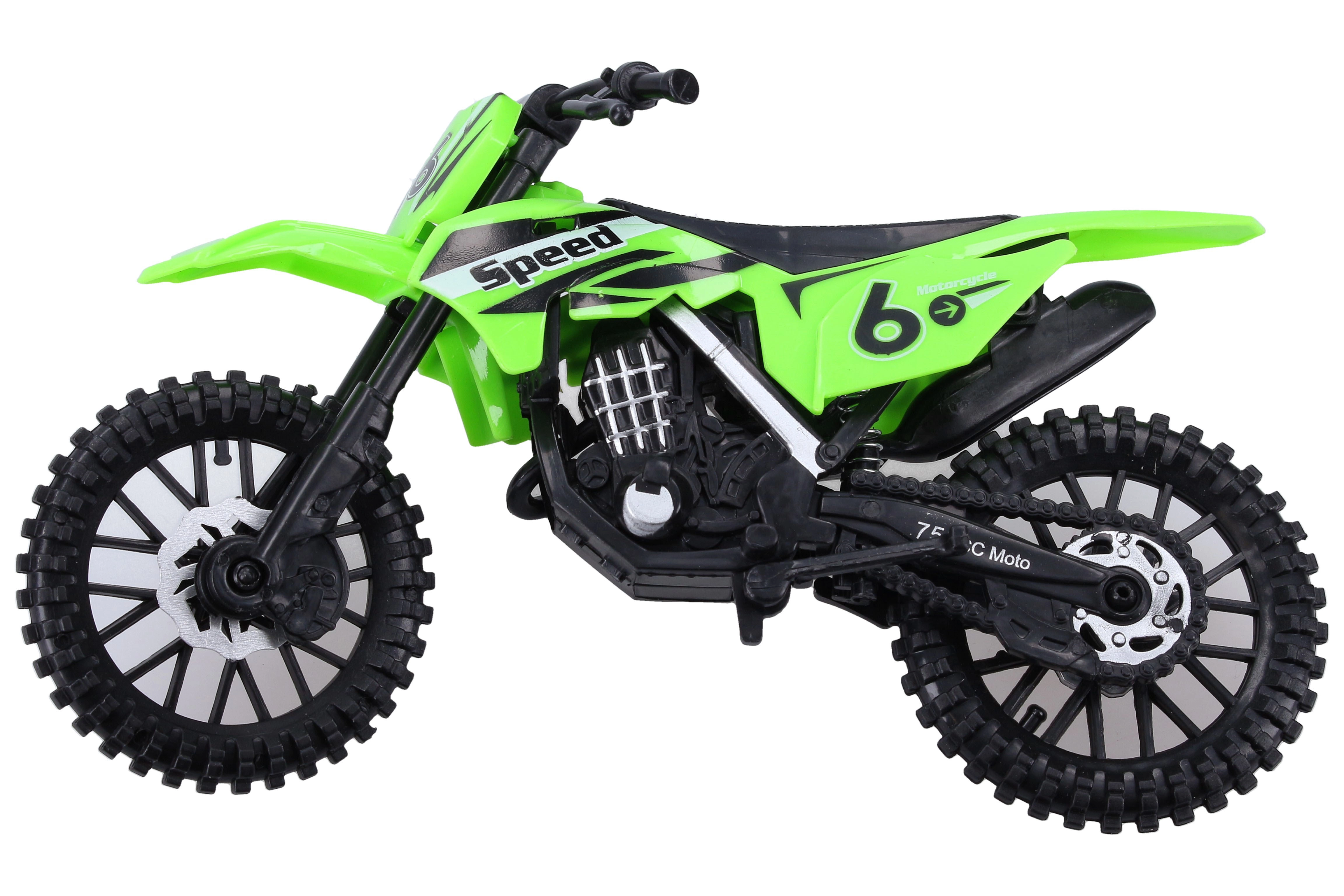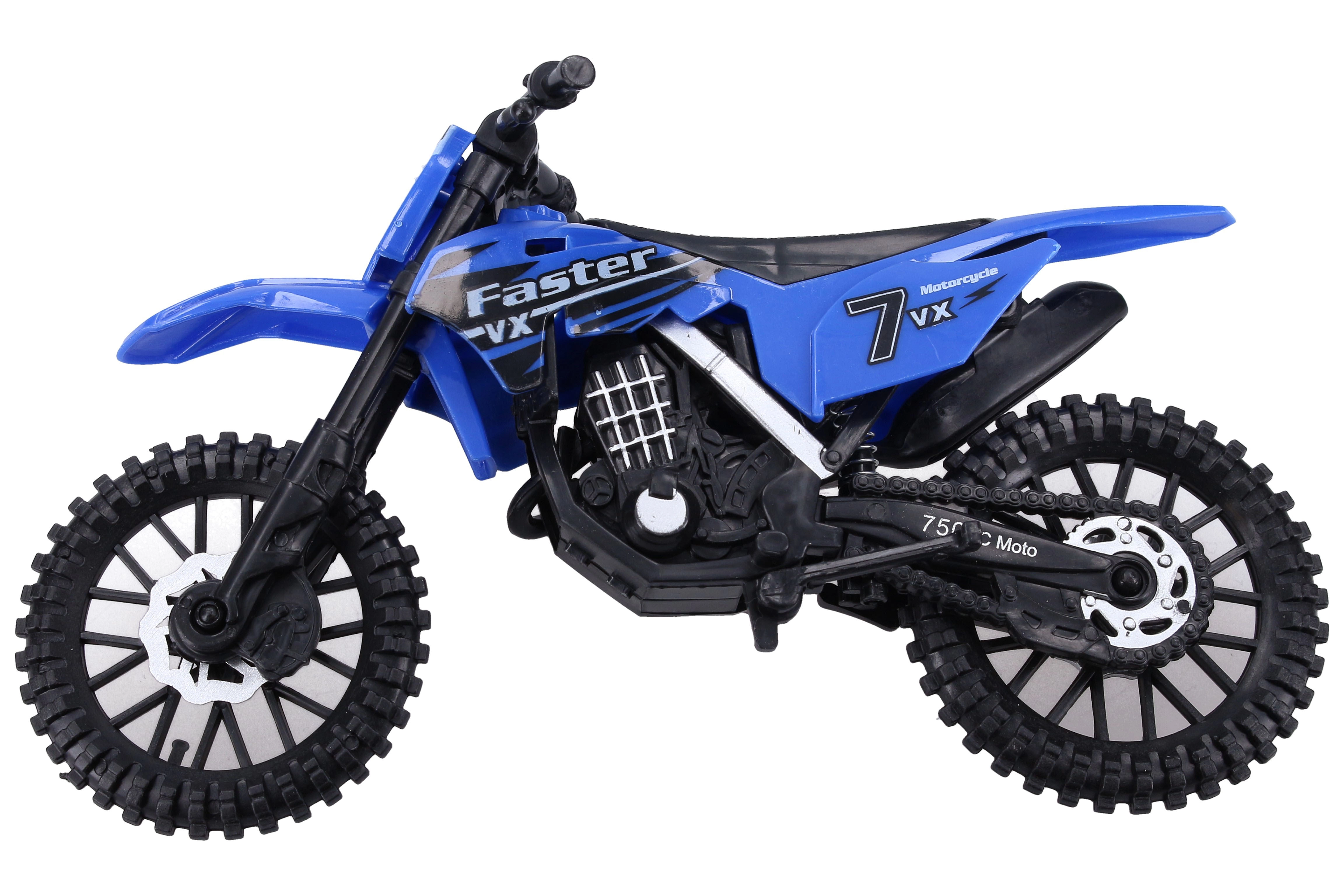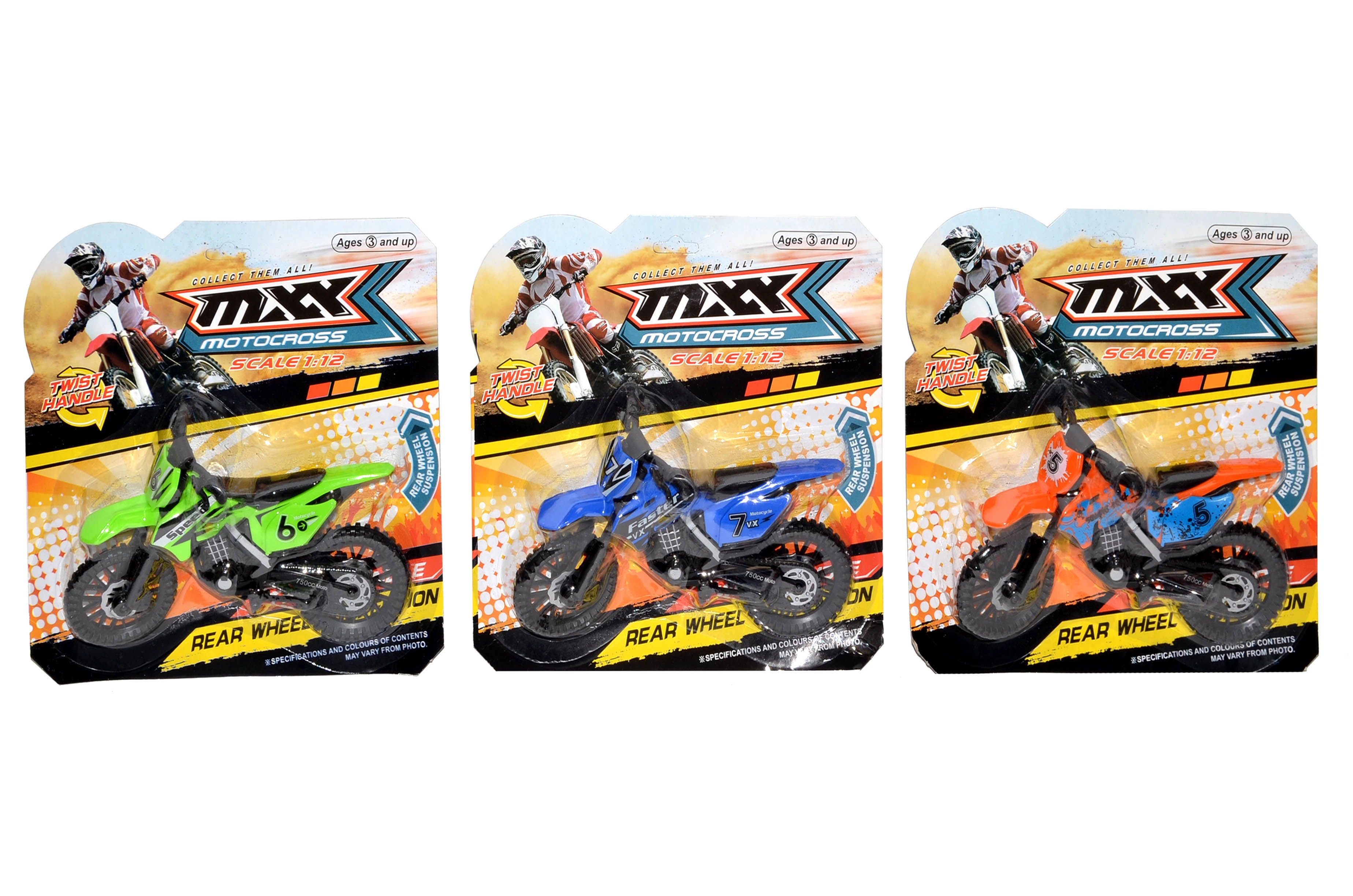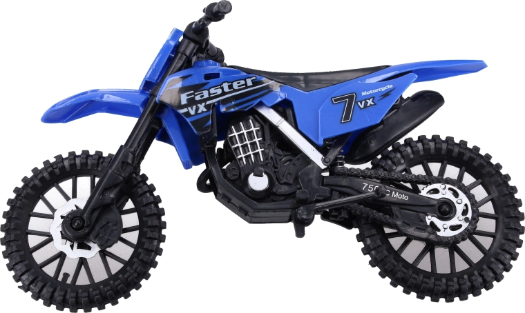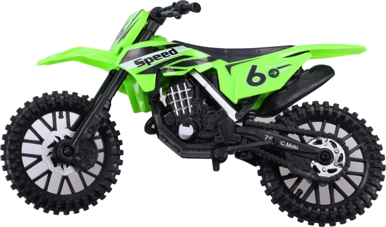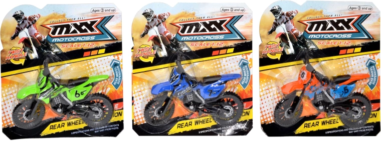 Η μοτοσικλέτα διατίθεται σε 3 χρωματικές εκδοχές με αγωνιστικά γραφικά (αριθμοί, επιγραφές) και εντυπωσιακό off-road στυλ. Το compact μέγεθος 19 cm ταιριάζει τέλεια στο παιδικό χέρι και στο σακίδιο για το ταξίδι.