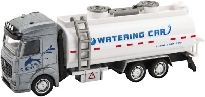 Μοντέλο αρδευτικού οχήματος με γκρι καμπίνα και λευκή δεξαμενή, που προσφέρει δυνατότητες θεματικού παιχνιδιού με υδάτινα στοιχεία.