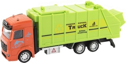 Αυτό το απορριμματοφόρο με πορτοκαλί καμπίνα και πράσινο αμάξωμα φέρνει στο παιχνίδι στοιχεία δημοτικής καθαριότητας.