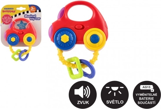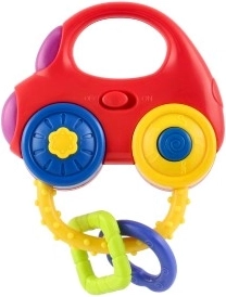 Το πολύχρωμο αυτοκινητάκι-κουδουνίστρα προσφέρει διασκέδαση και ερεθίσματα για την ανάπτυξη της ακοής, της όρασης και της λεπτής κινητικότητας. Αρκεί να το κουνήσετε ή να πατήσετε τα κουμπιά και το παιχνίδι θα ανάψει φωτάκια, θα ενεργοποιήσει μελωδίες και ρεαλιστικούς ήχους εκκίνησης, κίνησης και κόρνας. Οι компакт διαστάσεις 10 × 11 εκ. και οι στρογγυλεμένες γωνίες διευκολύνουν το κράτημα ακόμη και από τα πιο μικρά χεράκια.