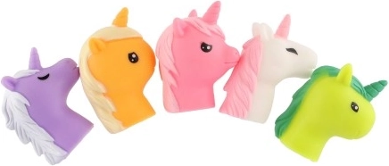 Αυτό το σετ περιλαμβάνει πέντε λαστιχένιους μονόκερους σε διαφορετικά χρώματα, καθένας με μοναδικό σχεδιασμό και έκφραση. Είναι φτιαγμένοι από υψηλής ποιότητας υλικό, που εξασφαλίζει αντοχή και ασφάλεια στο παιχνίδι.