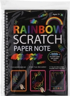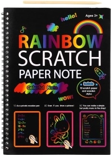 Αυτό το σημειωματάριο ξυσίματος με υπόβαθρο ουράνιου τόξου προσφέρει έναν απλό αλλά συναρπαστικό τρόπο για να δημιουργείτε πρωτότυπες εικόνες. Στην μαύρη επιφάνεια αρκεί να ξύσετε απαλά και αμέσως εμφανίζονται λαμπερά χρώματα ουράνιου τόξου. Εξαιρετικό για μικρούς καλλιτέχνες αλλά και ως χαλαρωτική δημιουργία για μεγαλύτερα παιδιά.