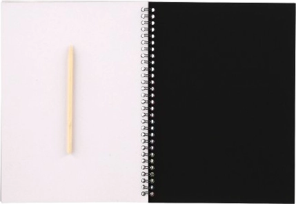 Το σημειωματάριο έχει διαστάσεις περίπου 19 × 26 cm και είναι σπιράλ δεμένο για άνετο ξεφύλλισμα. Στη συσκευασία θα βρείτε 10 φύλλα και ξύλινο στικ ξυσίματος, ώστε να ξεκινήσετε να δημιουργείτε αμέσως μετά το άνοιγμα.