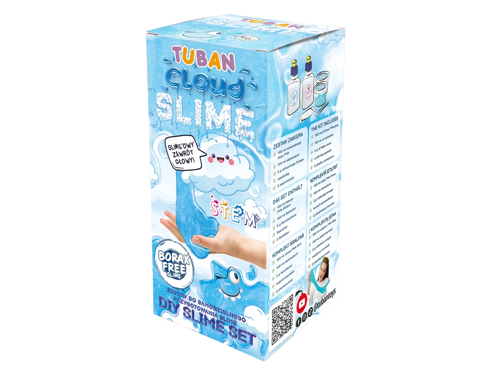 Το σετ Tuban cloud slime είναι ιδανικό για μικρούς και μεγάλους φίλους του slime. Χάρη στα προσεκτικά επιλεγμένα συστατικά, θα αποκτήσετε μπλε slime με μαλακή, αφράτη και «συννεφένια» υφή που θυμίζει φρέσκο χιόνι. Τέλειο για δημιουργία, αισθητηριακό παιχνίδι και ανάπτυξη λεπτής κινητικότητας.