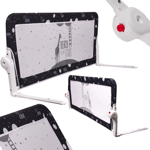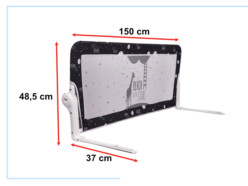 Πρακτικό παιδικό προστατευτικό κάγκελο κρεβατιού μήκους 150 cm με ανακλινόμενο μηχανισμό που αποτρέπει το παιδί από το να κυλήσει εκτός κρεβατιού τη νύχτα. Χάρη στον στιβαρό μεταλλικό σκελετό, τις ανθεκτικές πλαστικές συνδέσεις και το διαπνέον δίχτυ, προσφέρει αξιόπιστη προστασία, εύκολη συναρμολόγηση χωρίς τρύπημα και άνετη αναδίπλωση με το πάτημα κουμπιών.