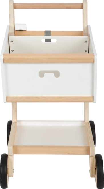 Αυτό το παιδικό καροτσάκι αγορών είναι κατασκευασμένο από ανθεκτικό ξύλο και διαθέτει ελαστικούς τροχούς για αθόρυβη και ομαλή κίνηση. Όπως και σε ένα πραγματικό σούπερ μάρκετ, υπάρχει δυνατότητα χρήσης μαγνητικής μάρκας στη θήκη. Το καροτσάκι προσφέρει ευρύχωρο καλάθι για διάφορα αντικείμενα και επιπλέον χώρο αποθήκευσης στο κάτω μέρος.