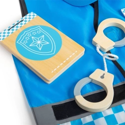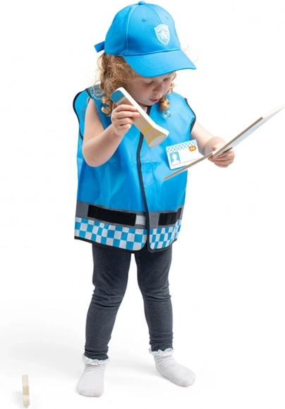 Η παιδική στολή αστυνομικού BIGJIGS TOYS ενθαρρύνει τη φαντασία και το παιχνίδι ρόλων. Το μπλε γιλέκο με ανακλαστικά στοιχεία, βέλκρο και λεπτομέρειες εξοπλισμού αστυνομικού, σε συνδυασμό με το ρυθμιζόμενο βαμβακερό καπέλο και τα ξύλινα αξεσουάρ, προσφέρει μια ρεαλιστική εμπειρία του επαγγέλματος του αστυνομικού.