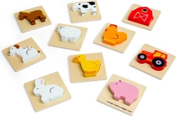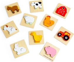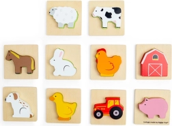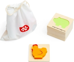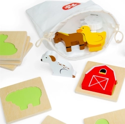 Αυτό το ταξιδιωτικό παιχνίδι με θέμα τη φάρμα προσφέρει στα παιδιά χαρά ανακάλυψης. Βάζουν το χέρι στο υφασμάτινο πουγκί και, με την αφή, βρίσκουν το κομμάτι που ταιριάζει στη σχετική ξύλινη βάση. Διασκέδαση που υποστηρίζει διακριτικά τη συγκέντρωση, τον συντονισμό ματιού–χεριού και το λεξιλόγιο κατά την ονομασία ζώων και αντικειμένων της φάρμας.