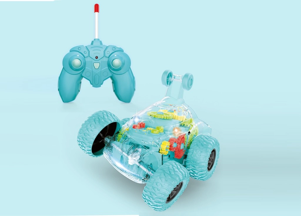 Διασκεδαστικό RC αυτοκίνητο με διάφανο πράσινο σασί που αποκαλύπτει κινούμενα γρανάζια και προσφέρει περιστροφή 360° επί τόπου, κασκαντερικά κόλπα, φωτεινά και ηχητικά εφέ και εύκολο χειρισμό εμπρός/πίσω καθώς και αριστερά/δεξιά. Εμβέλεια τηλεχειριστηρίου έως 10 m, μέγιστη ταχύτητα 5 km/h.