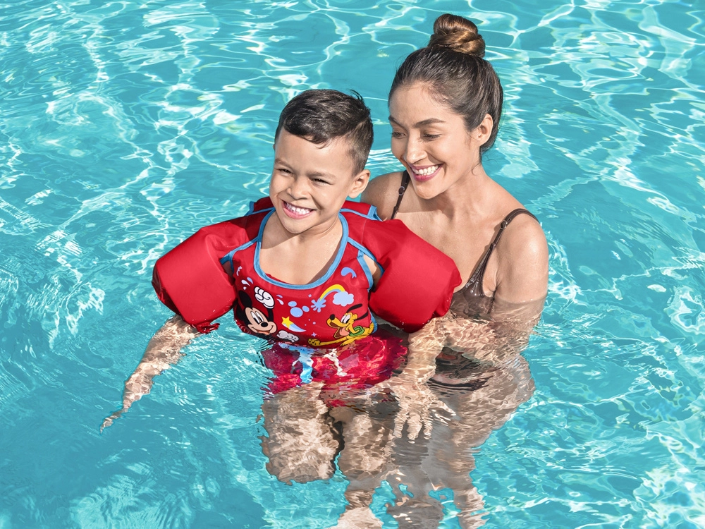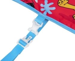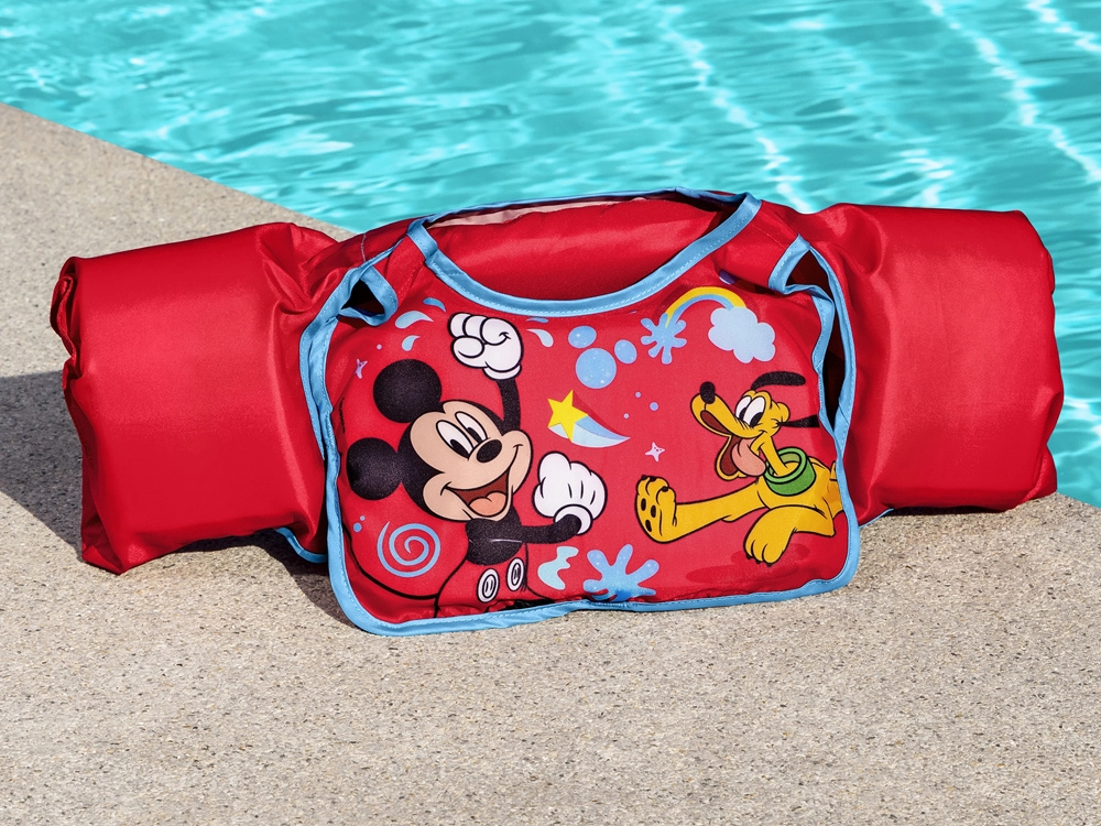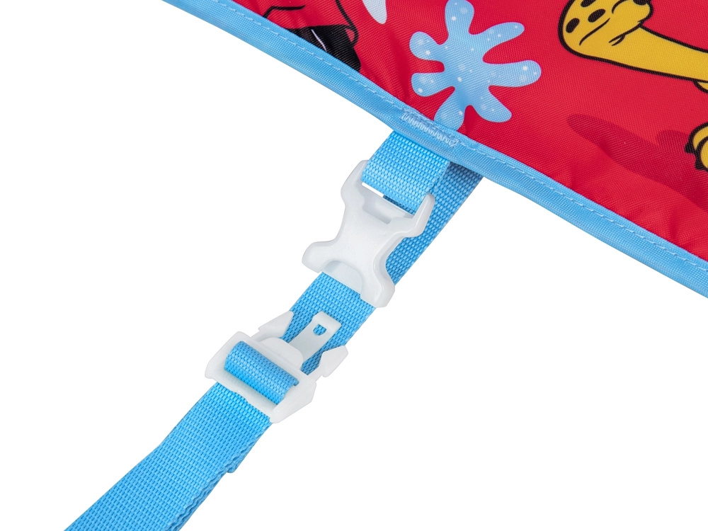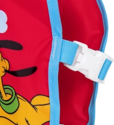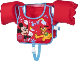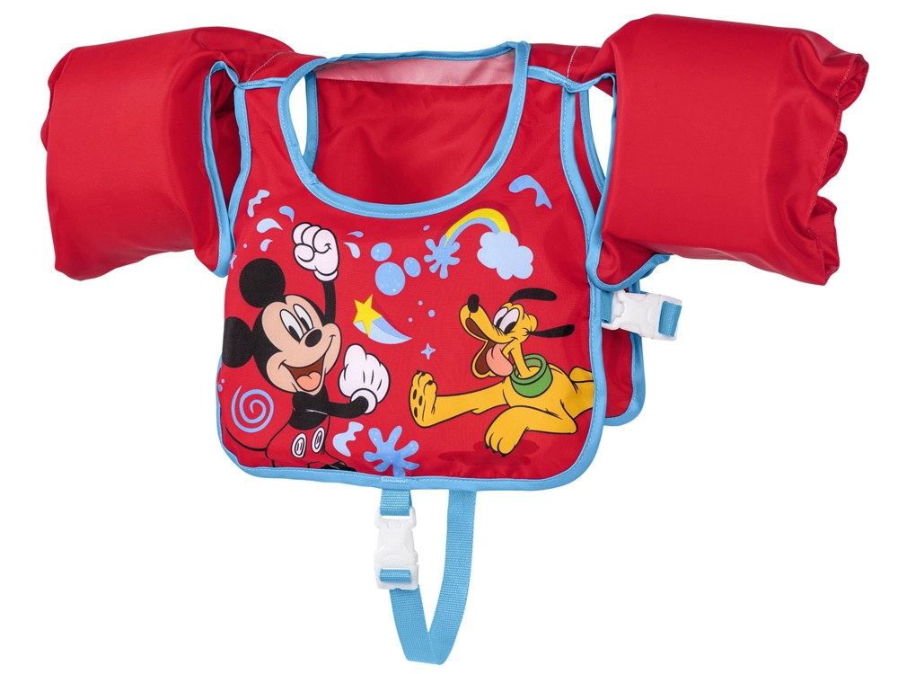Το υφασμάτινο, υλικό γρήγορου στεγνώματος είναι ευχάριστο στην αφή και, σε αντίθεση με το λάστιχο, δεν κολλά στο δέρμα. Το χαρούμενο μοτίβο Mickey Mouse και Pluto παρακινεί τα παιδιά σε παιχνίδι και εκμάθηση κολύμβησης, ενώ το έντονο κόκκινο χρώμα αυξάνει τη ορατότητα στο νερό. Η προτεινόμενη περίμετρος στήθους είναι 56 cm. Το σωσίβιο προορίζεται για χρήση μόνο μέσα στο νερό, υπό την επίβλεψη ενήλικα.