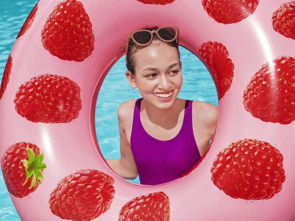 Παιχνιδιάρικος σχεδιασμός με ρεαλιστικά σμέουρα που ξεχωρίζει στην πισίνα και στη θάλασσα, δίνοντας στο καλοκαίρι σας έναν έντονο χαρακτήρα.
