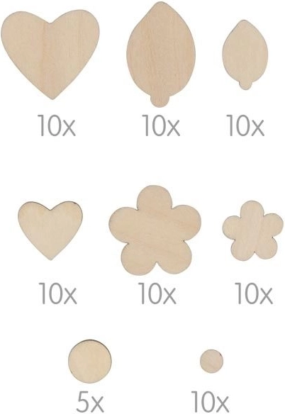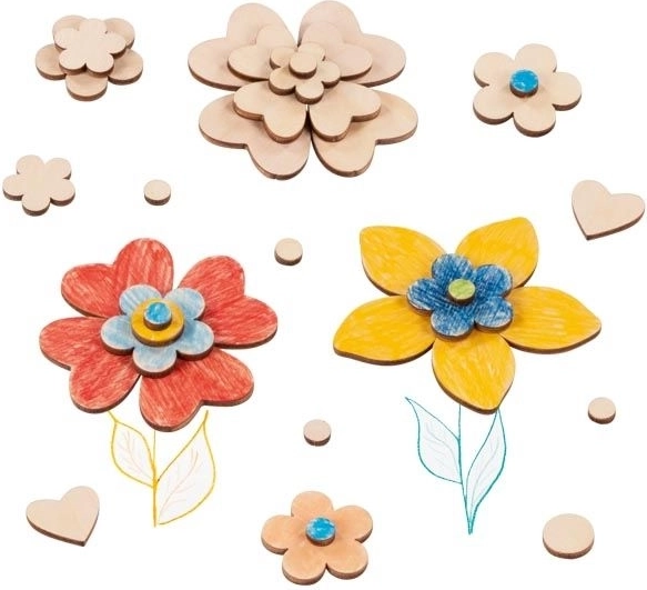 Με αυτό το πολύχρωμο σετ ξύλινων πλακιδίων σε σχήμα λουλουδιών θα δημιουργήσετε πρωτότυπες διακοσμήσεις, κάρτες, εικόνες και εποχιακό στολισμό. Τα κομμάτια με διαστάσεις από 7 έως 32 mm κολλούν, συνδυάζονται και βάφονται εύκολα, ώστε τα παιδιά να αναπτύσσουν τη φαντασία και την επιδεξιότητά τους.