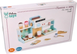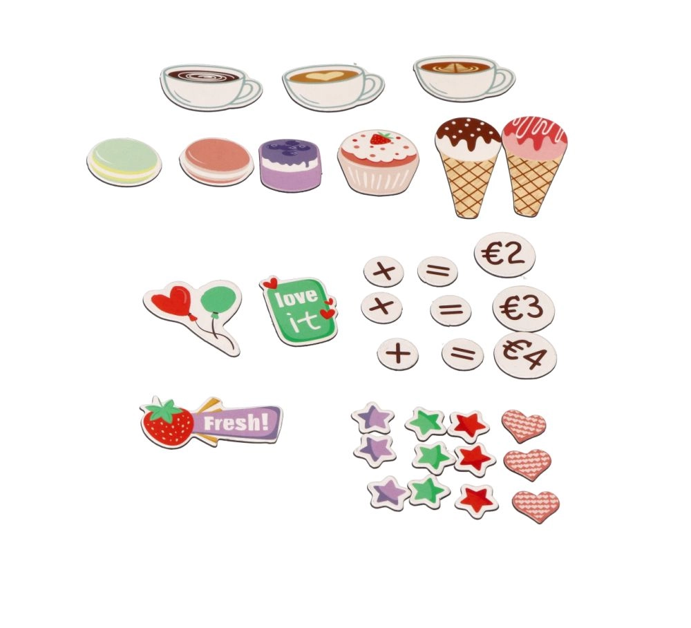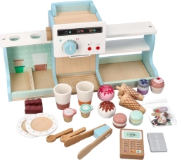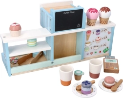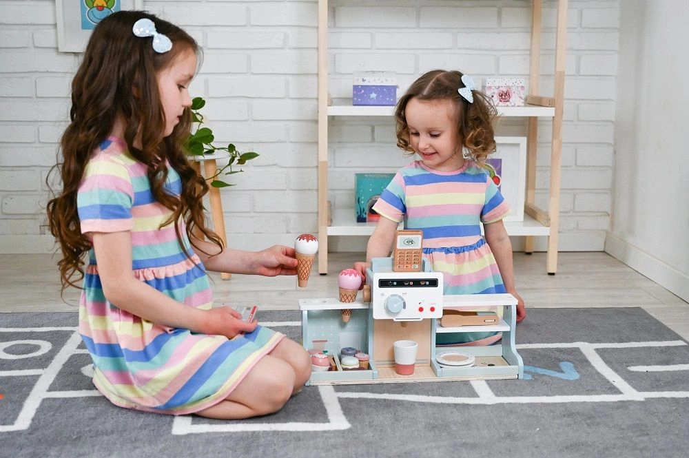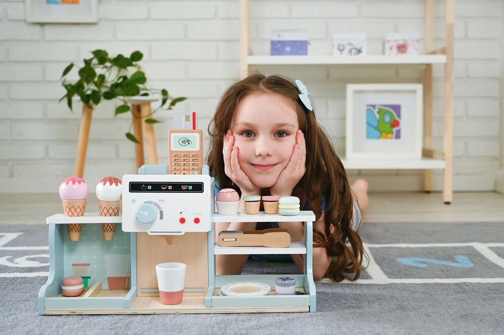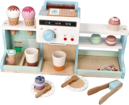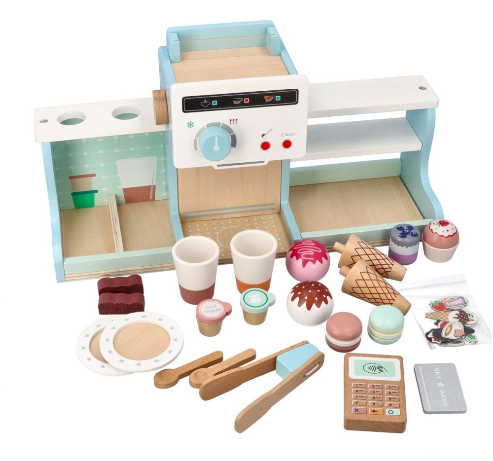 Αυτό το ξύλινο παγωτατζίδικο και καφετέρια προσφέρει στα παιδιά αυθεντική εμπειρία εξυπηρέτησης σε μικρό μπιστρό. Χάρη στα πολύχρωμα αξεσουάρ, τα περιστροφικά κουμπιά και τα ρεαλιστικά στοιχεία της καφετιέρας και του πάγκου παγωτού, τα παιδιά εξασκούν τη λεπτή κινητικότητα, την επικοινωνία και τη φαντασία.