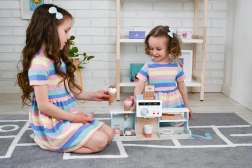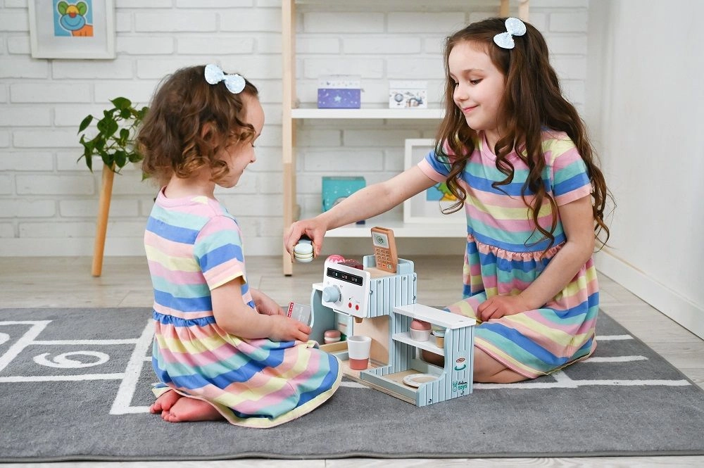 Τα παιδιά μπορούν να «ετοιμάσουν» εσπρέσο, να γυρίσουν τα κουμπιά και να εξυπηρετήσουν τους πελάτες όπως σε μια μικρή καφετέρια. Εξαιρετική βάση για παιχνίδι μπαρίστα.