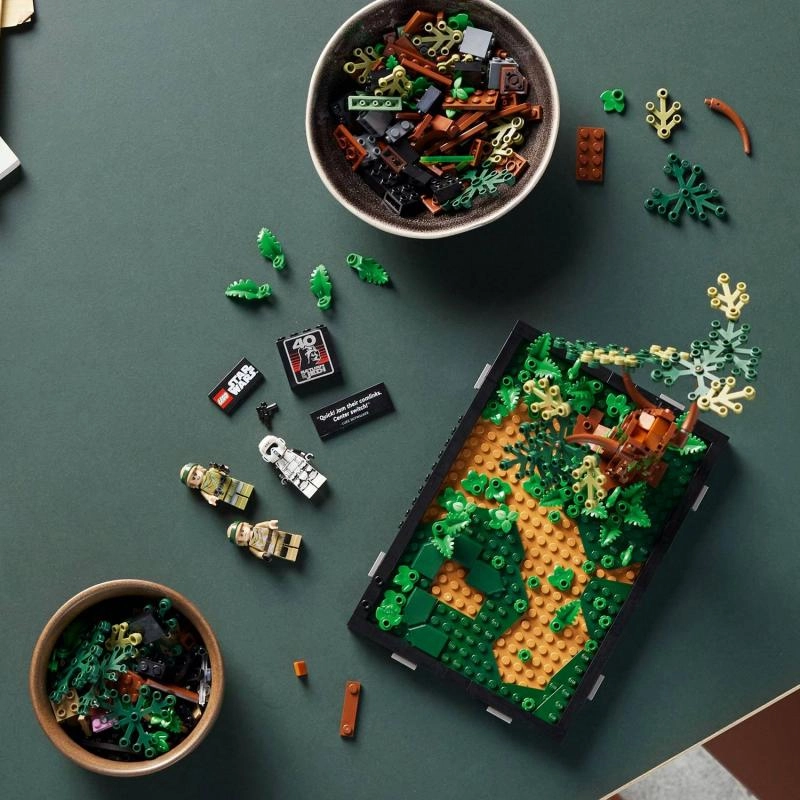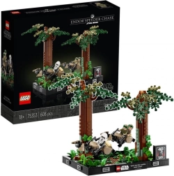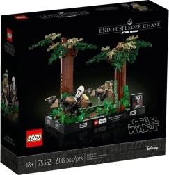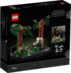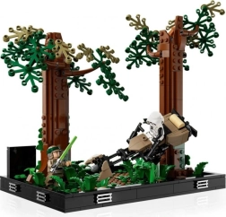 Απολαύστε την εμπειρία κατασκευής και δημιουργήστε τη σκηνή της ξέφρενης καταδίωξης στον δασώδη δορυφόρο Έντορ. Το διοράμα συνδυάζει αυθεντικές λεπτομέρειες με καθαρό σχεδιασμό έκθεσης: δύο σπίντερ με δυνατότητα κλίσης, ένα ζευγάρι ρυθμιζόμενων κορμών δέντρων και νέα στοιχεία φτερών (5/2023). Περιλαμβάνονται μινι φιγούρες της πριγκίπισσας Λέια, του Λουκ Σκάιγουοκερ με πράσινο φωτόσπαθο και ανιχνευτή στορμτρούπερ.