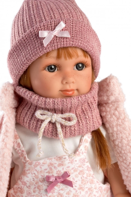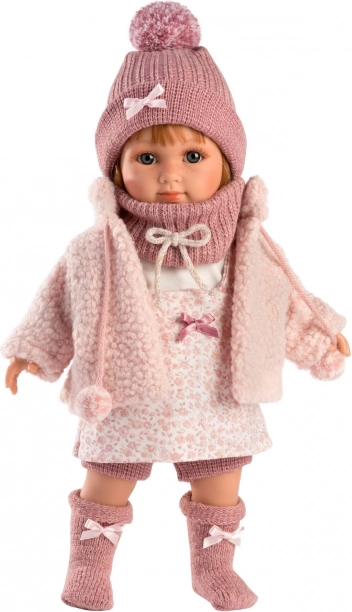 Η κούκλα είναι ντυμένη με λουλουδάτο φόρεμα, συμπληρωμένο με πλεκτό καπέλο και ζεστές κάλτσες, δημιουργώντας μια ζωηρή και χαρούμενη εμφάνιση.