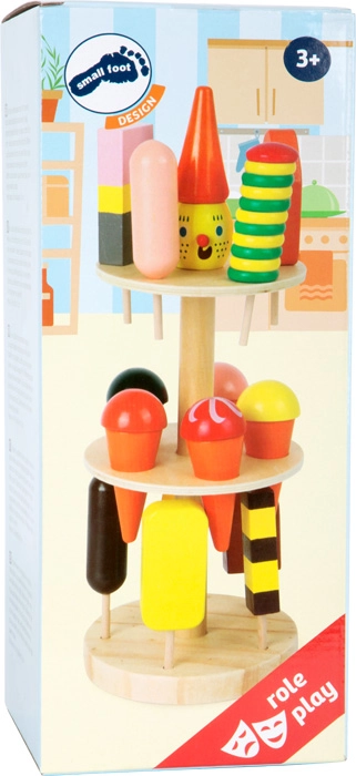 Η τριώροφη βάση για παγωτά SMALL FOOT είναι ιδανικό συμπλήρωμα για την παιδική κουζίνα ή το παιχνιδόσπιτο-μαγαζάκι. Τα ξύλινα παγωτά και οι γρανίτες με χρωματιστή λάκα (περίπου 8–10 cm) τοποθετούνται εύκολα στις προβλεπόμενες οπές και προσκαλούν σε ατελείωτες δόσεις δημιουργικού παιχνιδιού.