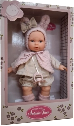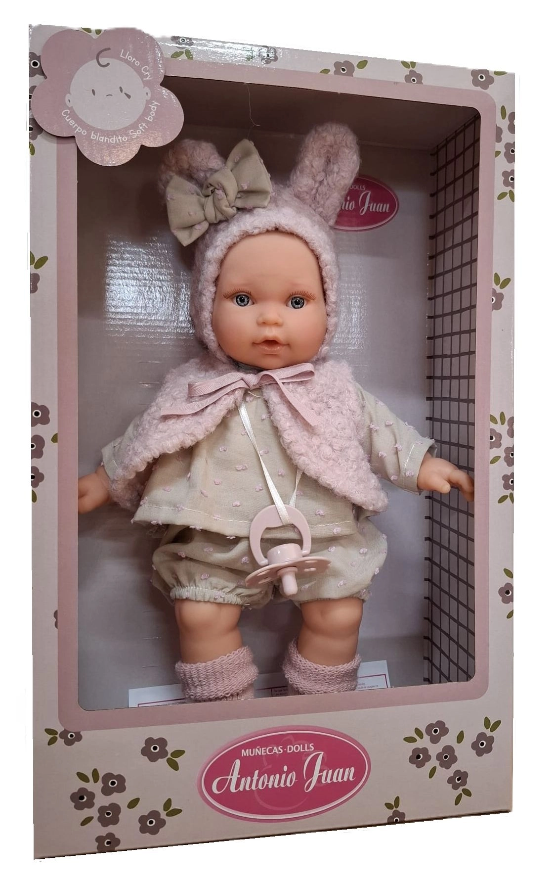 Η χαριτωμένη κούκλα Antonio Juan Kika, ύψους 27 cm, μοιάζει με αληθινό μωρό – έχει μαλακό υφασμάτινο σώμα, κεφαλή και άκρα από βινύλιο, ανταποκρίνεται στη χρήση μαγνητικής πιπίλας και όταν την αφαιρέσετε κλαίει και λέει «μαμά», «μπαμπά». Παραδίδεται σε συσκευασία δώρου, είναι χειροποίητη και μέρος των ρούχων είναι από οργανικό βαμβάκι. Κατάλληλη από 2 ετών.