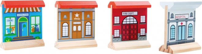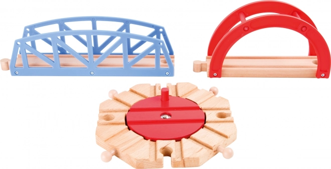 - Δέντρα, διάφορα ξύλινα κτίρια και χρωματιστές μηχανές και βαγόνια για την πλήρη ολοκλήρωση του παιδικού σιδηροδρομικού κόσμου.