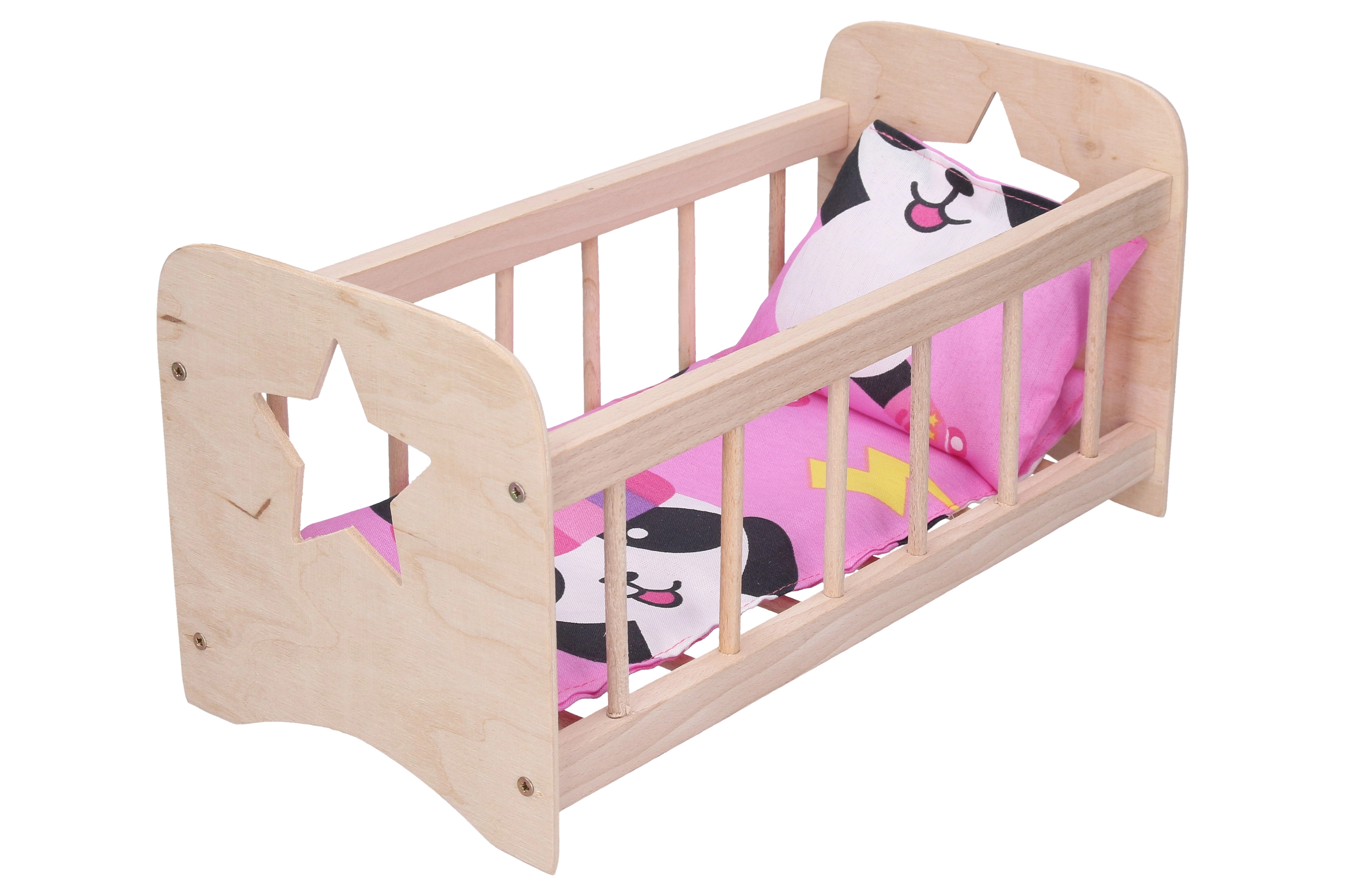 Χαριτωμένη ξύλινη κούνια για κούκλες με διαστάσεις 30 × 15 εκ. που θα χαροποιήσει κάθε μικρή φροντίστρια. Διαθέτει στιβαρή κατασκευή και είναι ιδανική για παιχνίδι οικογένειας, για να βάζετε τις κούκλες για ύπνο και για την ανάπτυξη της φαντασίας. Το σταθερό φινίρισμα, το συμπαγές μέγεθος και τα ασφαλή στρογγυλεμένα σχήματα την καθιστούν υπέροχο συμπλήρωμα για το παιδικό δωμάτιο.